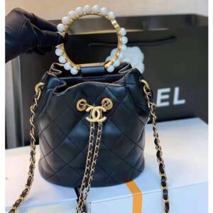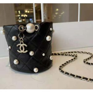 Chanel Women Mini Bucket Bag Calfskin Imitation Pearls Gold Tone Metal Black