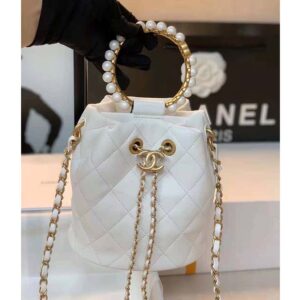 Chanel Women Mini Bucket Bag Calfskin Imitation Pearls Gold Tone Metal White