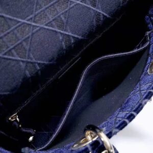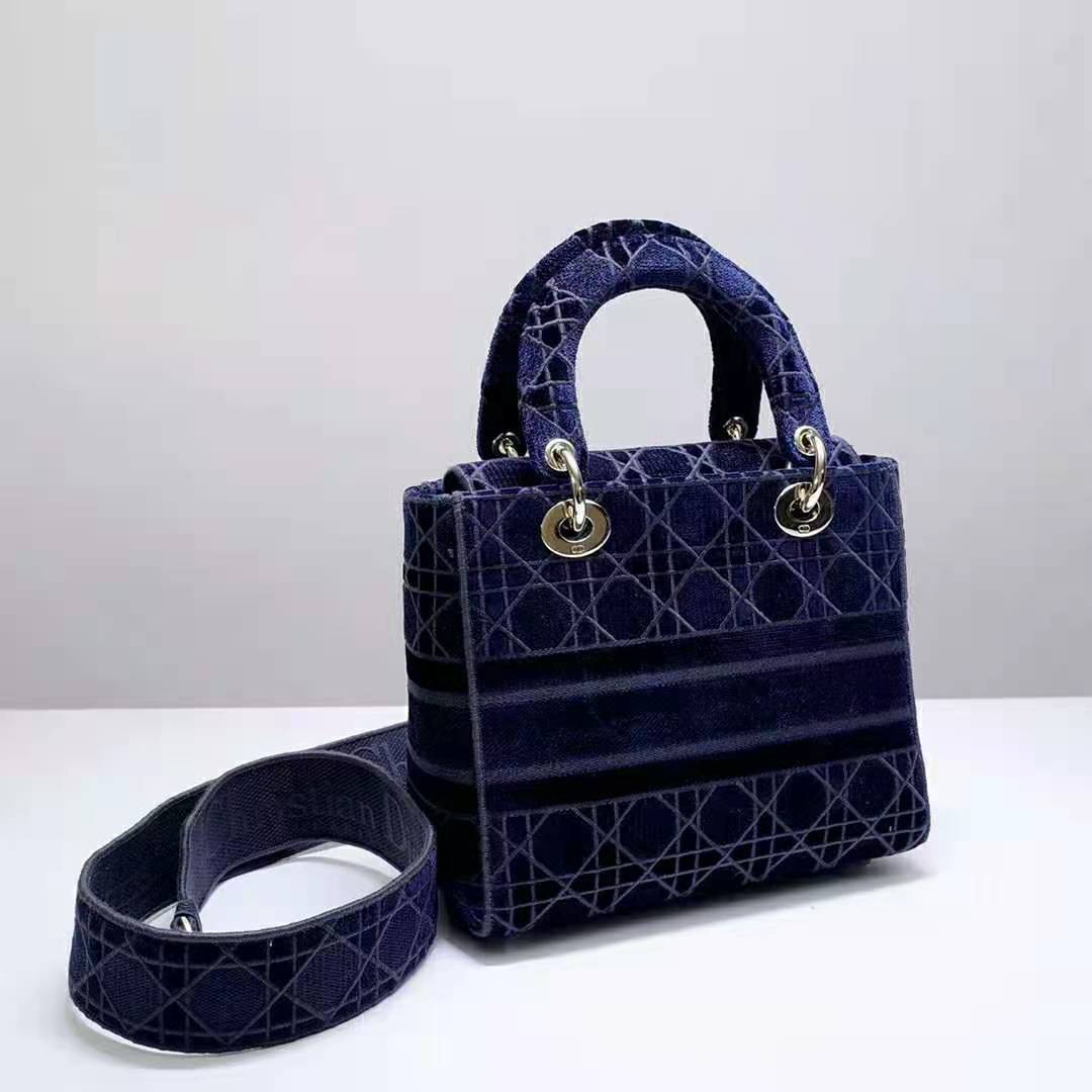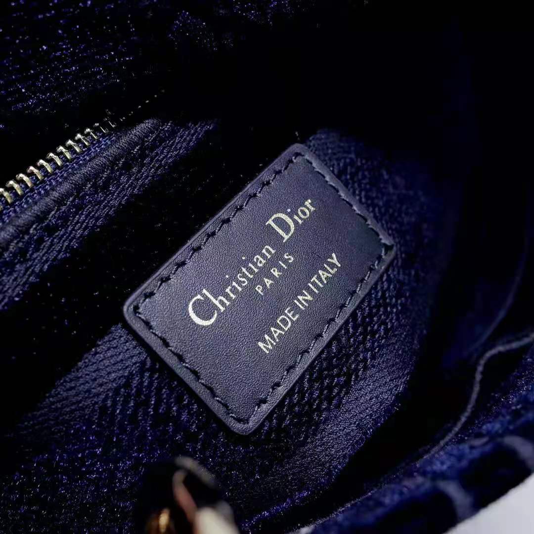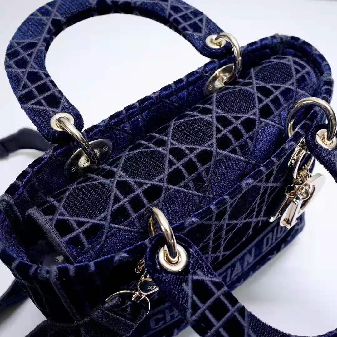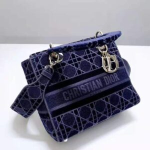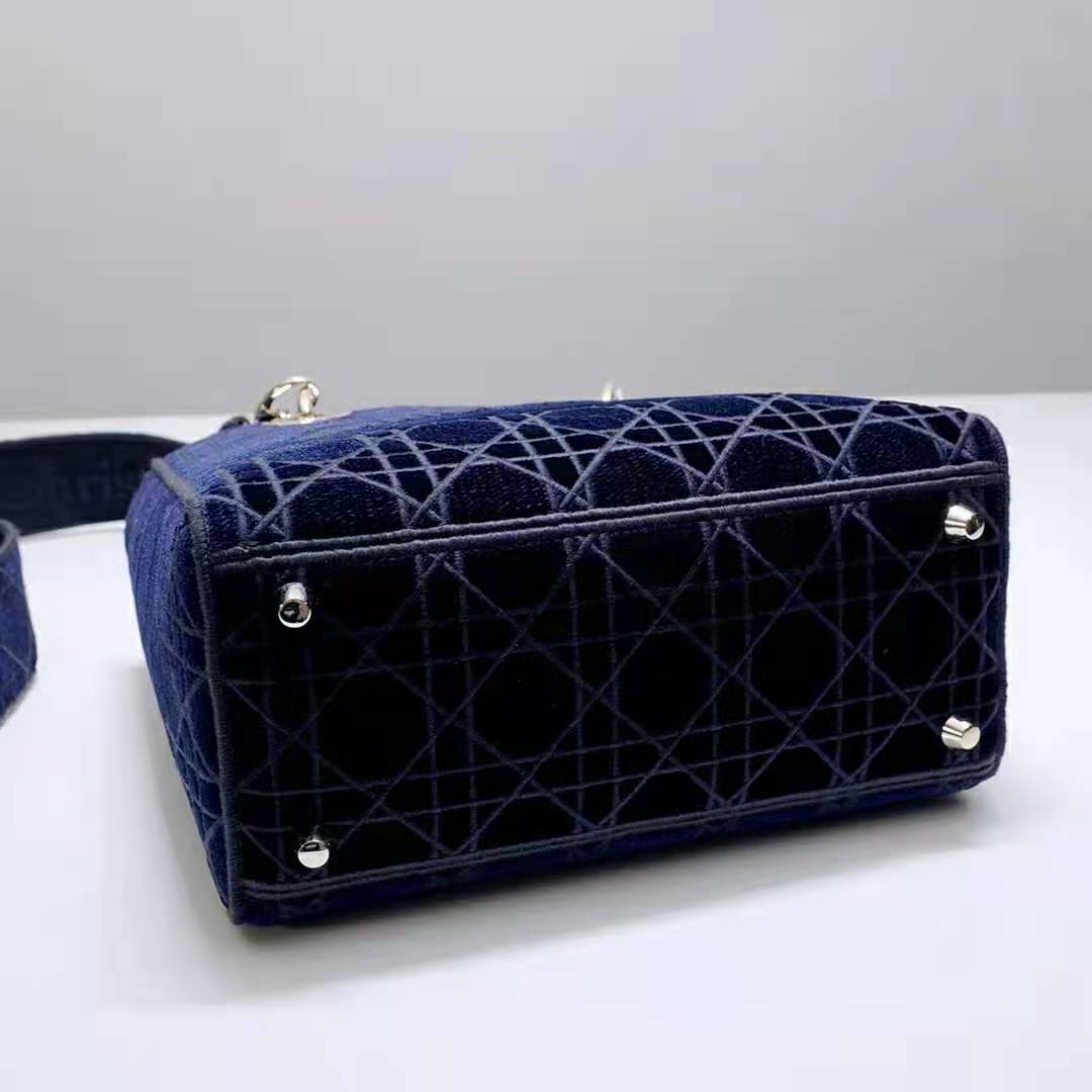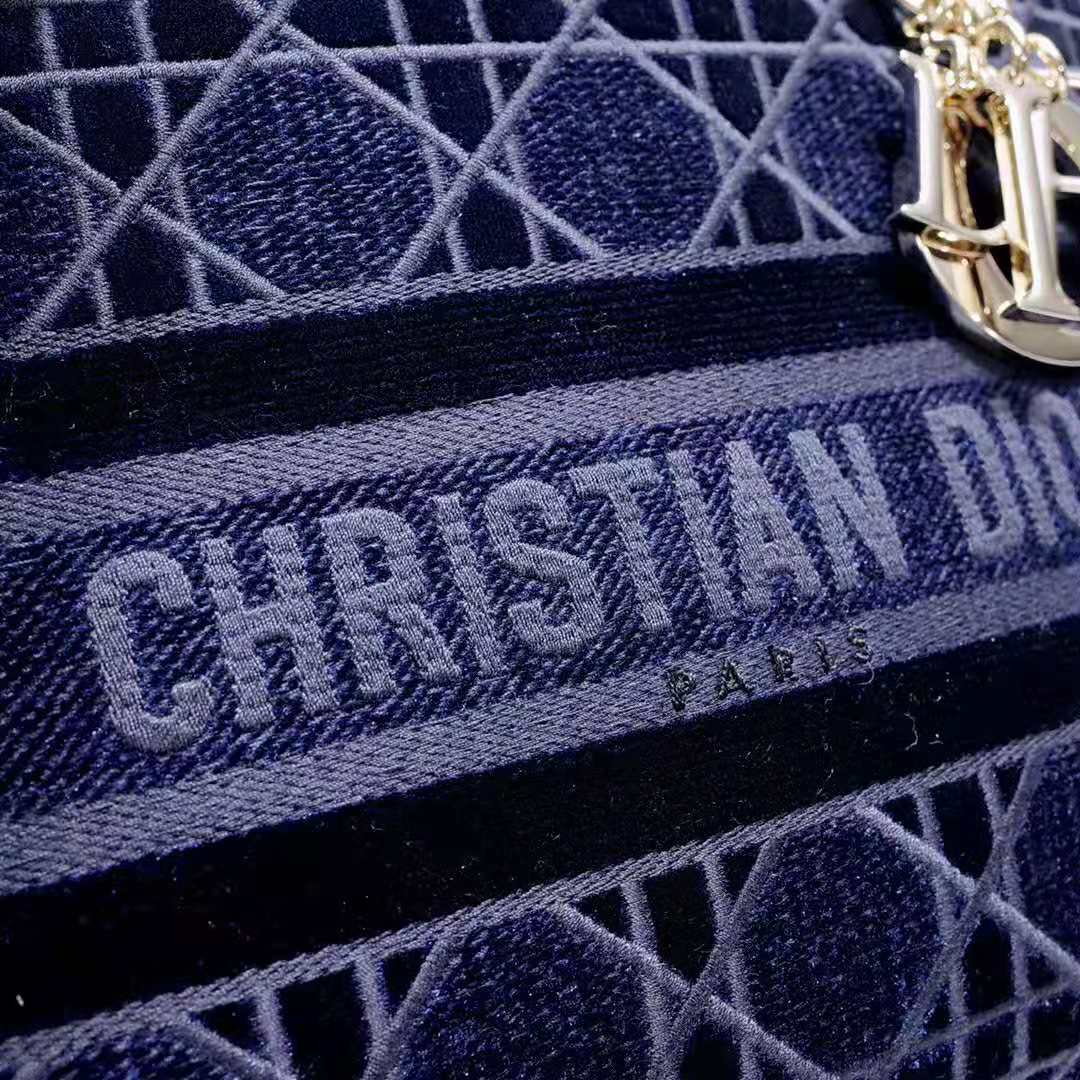 A sleek and feminine blue velvet bag that is fully embroidered with the Cannage motif in contrasting matte cotton thread and features a tonal ‘Christian Dior’ signature on the front.