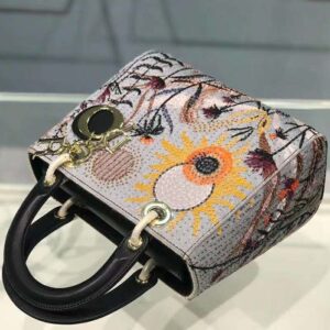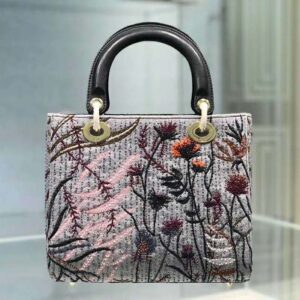 Inspired by Catherine Dior’s strong and independent personality and her love of gardening, the handbag is crafted with the Jardin au Crépuscule fully embroidered calfskin featuring hand-embroidered beads and portraying a wild utopian garden.