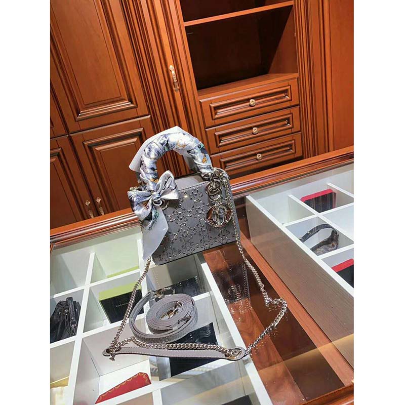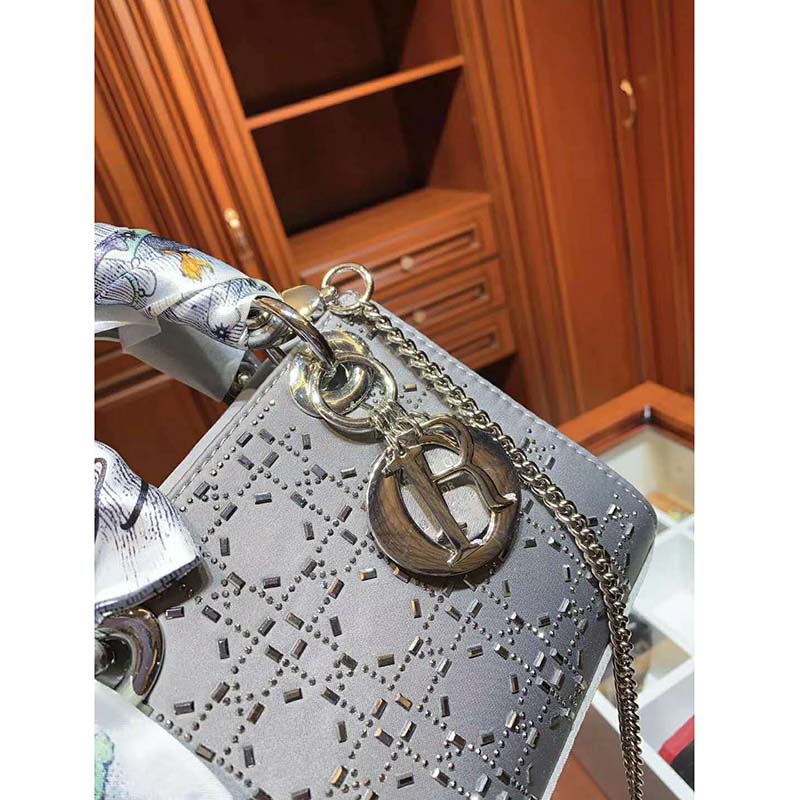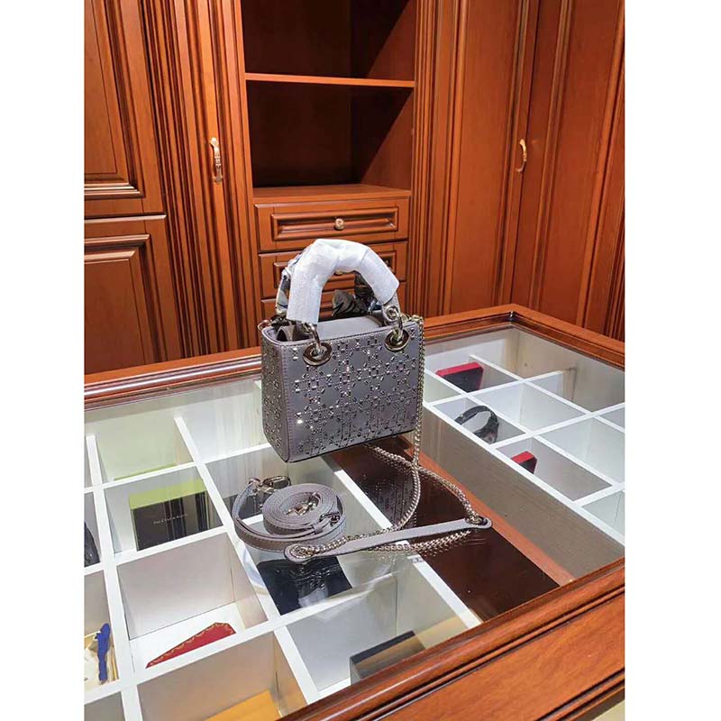 Crafted from gray satin, the design is embroidered with strass for sophisticated evening allure. The palladium-finish metal signature ‘D.I.O.R.’ charms further embellish its silhouette.