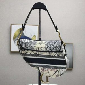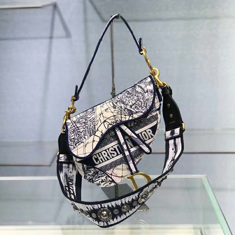 Fully embroidered with the blue multicolor Dior Around the World pattern, this medium style may be customized with alternative straps.