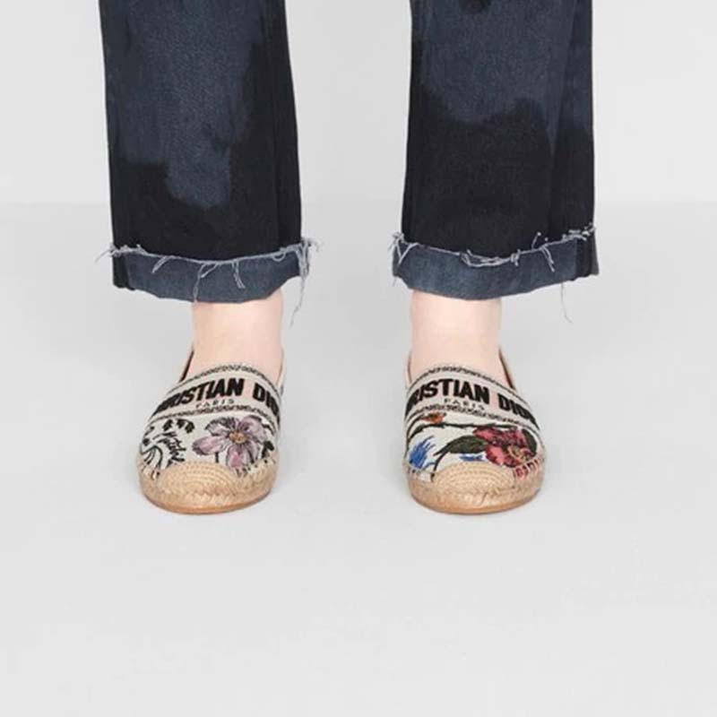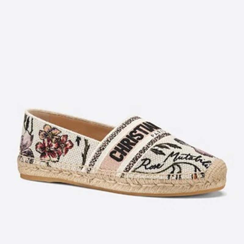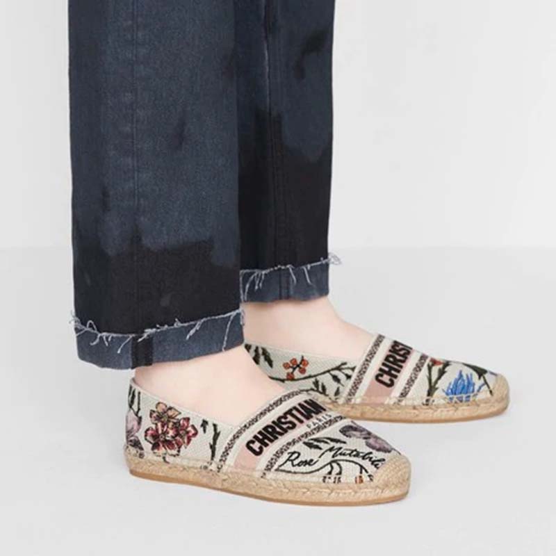 The Dior Granville espadrille has a relaxed feel. Portraying many classic design elements of the House, the shoe’s upper is fully embroidered with the ‘Christian Dior’ signature and the Rosa Mutabilis print.