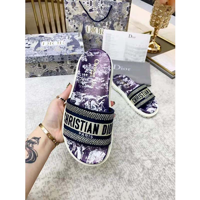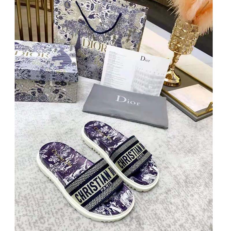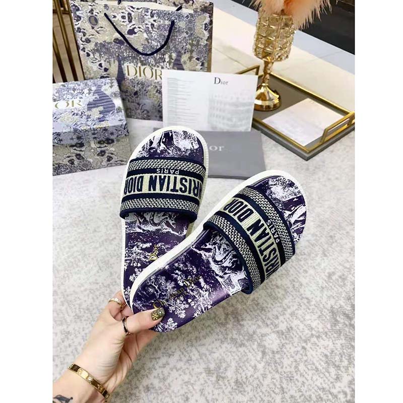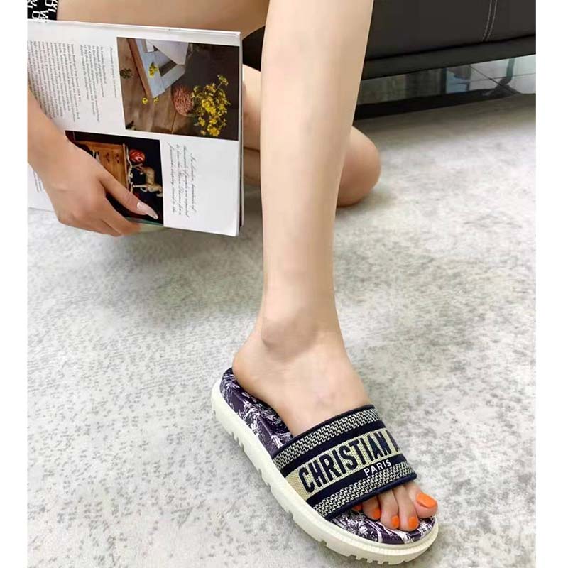 The Toile de Jouy Reverse motif reimagines the hallmark pattern with a play on reversed colors. The upper, with its deep blue embroidered ‘CHRISTIAN DIOR’ signature, is completed by a thick leather anatomically-shaped sole.