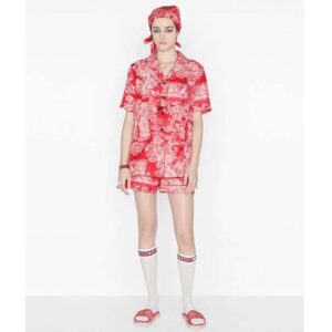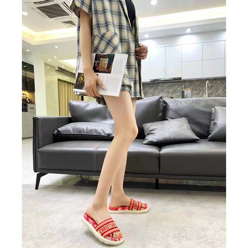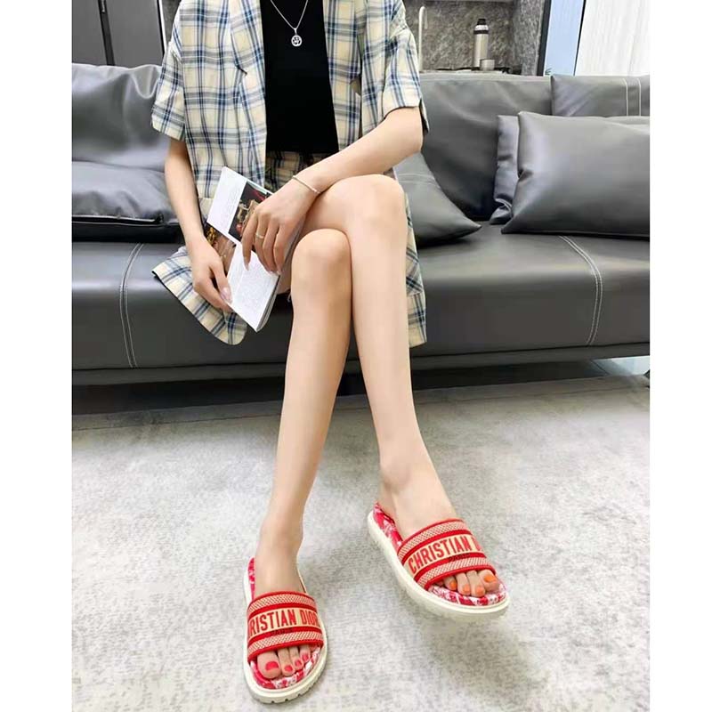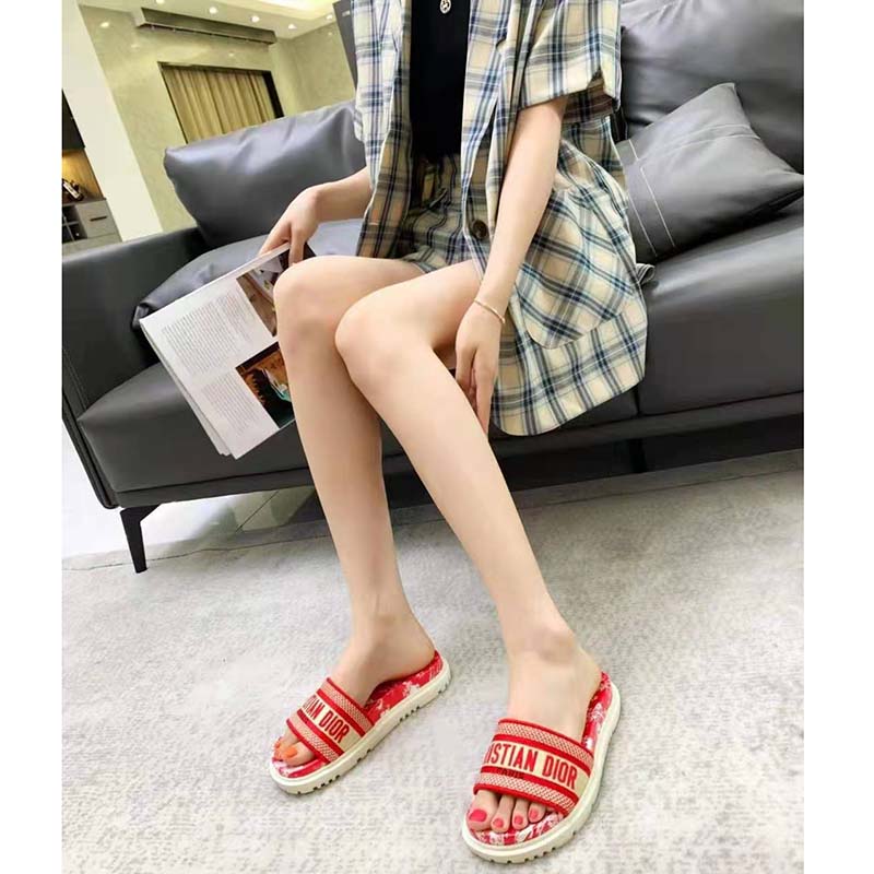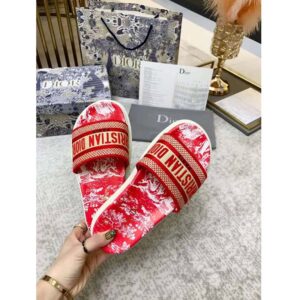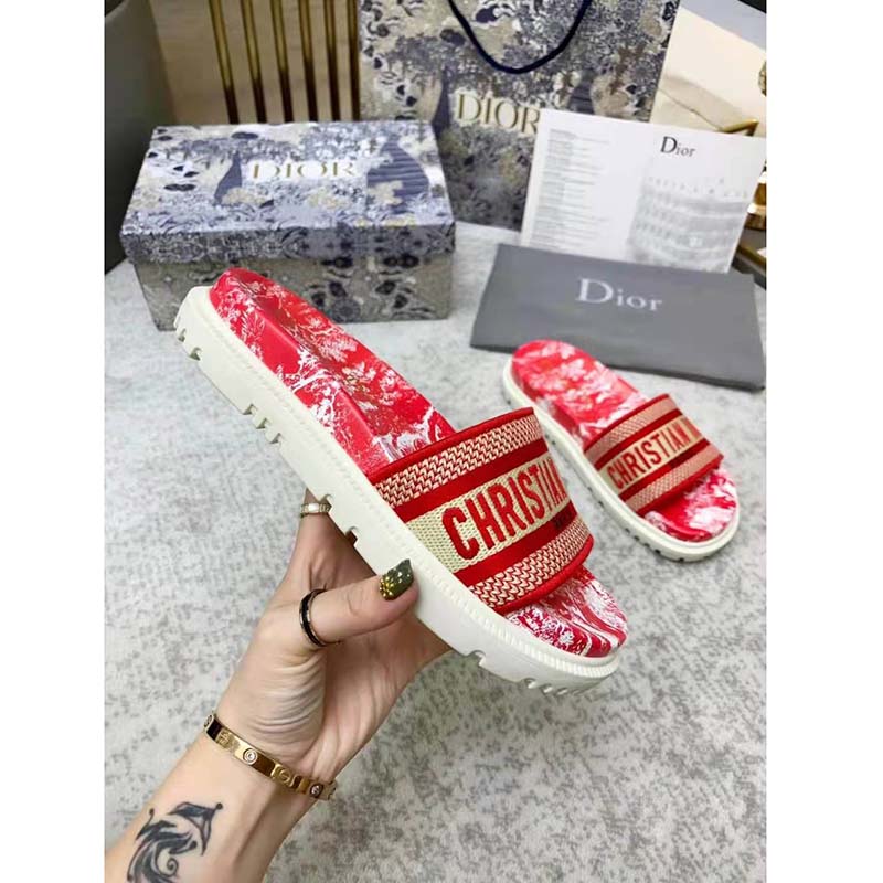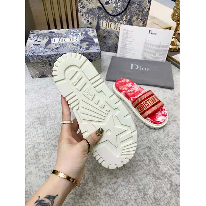 The Toile de Jouy Reverse motif reimagines the hallmark pattern with a play on reversed colors. The upper, with its raspberry embroidered ‘CHRISTIAN DIOR’ signature, is completed by a thick leather anatomically-shaped sole.