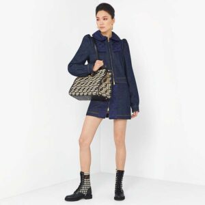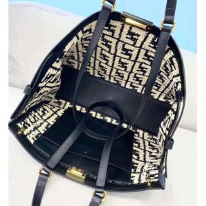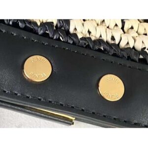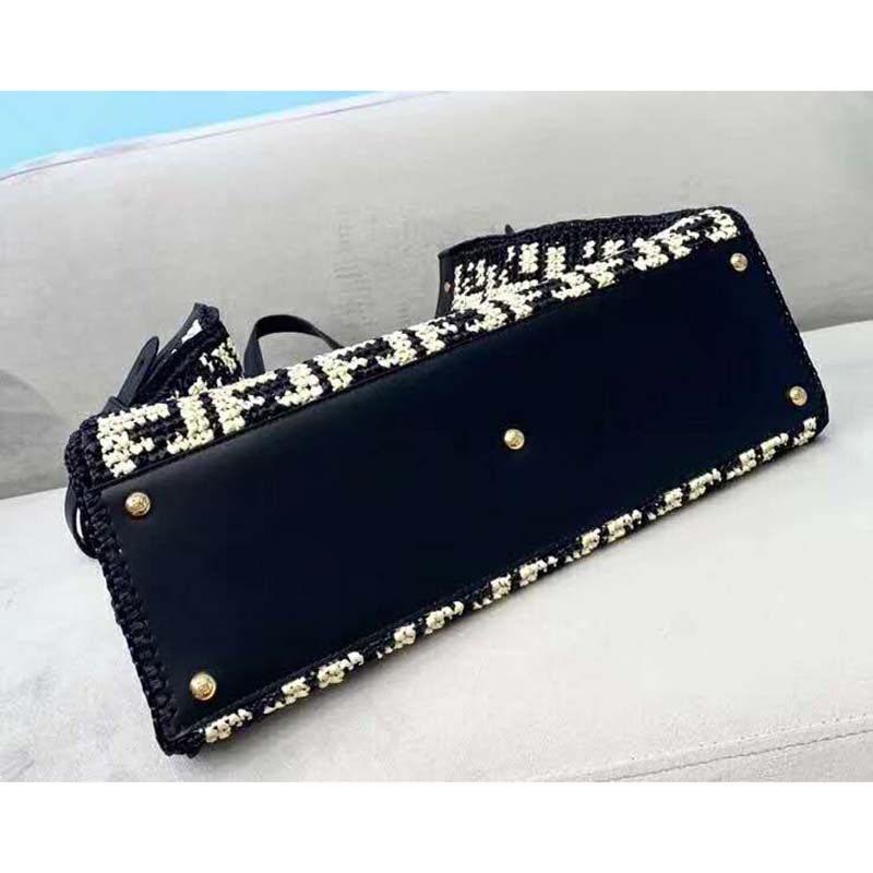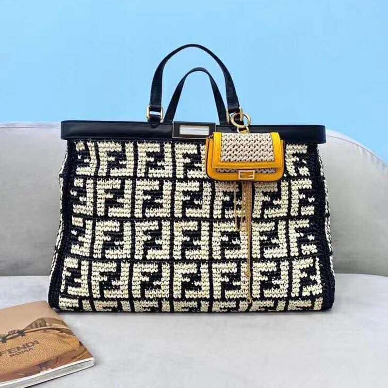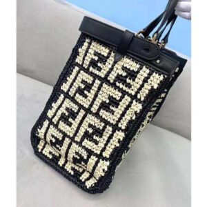 Large Peekaboo X-tote bag, made of raffia with beige FF motif on a black background, finished with black leather edges and decorated with the classic twist lock.
