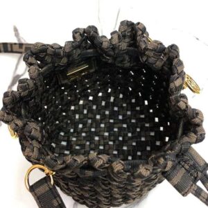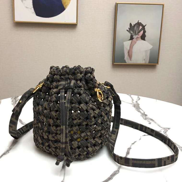 Small Mon Tresor bucket bag with drawstring fastening and metal decorations in the Fendi logo shape.