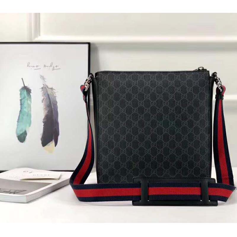 A flat messenger bag made in Gucci’s iconic GG Supreme canvas in a black/grey combination. The GG motif is further enriched with a Web strap and black leather trims.