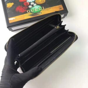 The print appears in metallic gold printed against black leather in the long zip around wallet.
