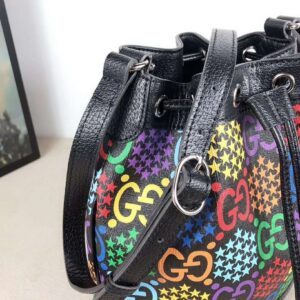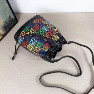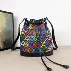 A modern take on the historic GG pattern, the GG Psychedelic motif decorates classic shapes throughout the Cruise 2020 collection, including the bucket bag with drawstring closure.