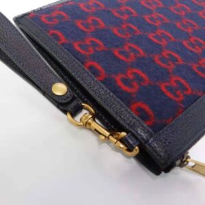 The zippered pouch is presented in blue and red GG wool—a contemporary interpretation of the original 1930s design, the distinctive fabric is displayed throughout the Cruise 2020 ready-to-wear and accessories.