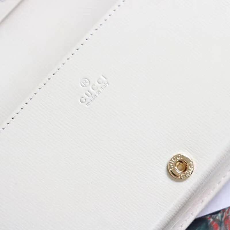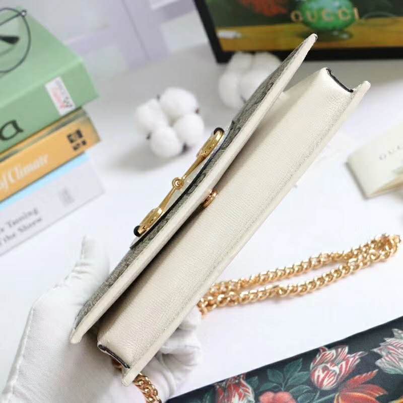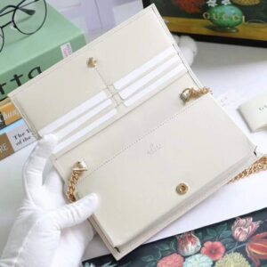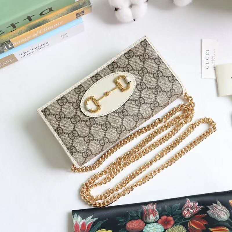 The chain wallet is presented as part of the Gucci 1955 Horsebit accessories collection in the House’s monogram canvas, defined by the double ring and bar design also found in Handbags. The folded snap-closure shape features several card slots and pockets, completed with a detachable chain strap.