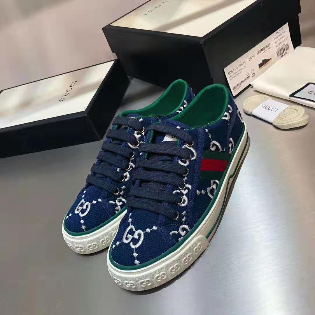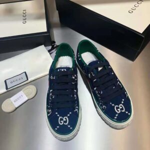 A low-top sneaker presented in blue and ivory stretch cotton with the House’s monogram motif. The style combines different elements from the brand’s heritage such as the Gucci Tennis 1977 label, a textured GG motif at the sole and the House Web—details which recall the House’s connection to the world of sports and leisure.