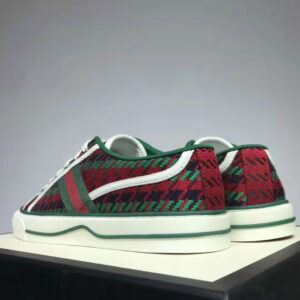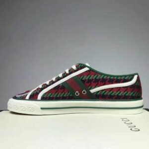 A low-top sneaker in red and green houndstooth wool with an Interlocking G on the front.