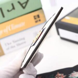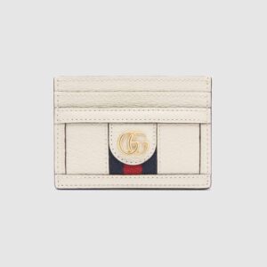 A white leather card case enhanced by the blue and red House Web.