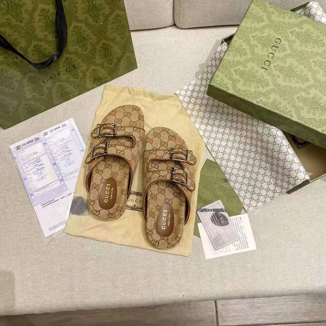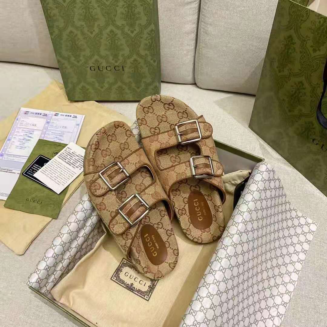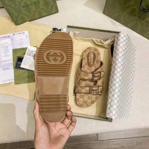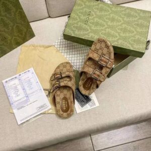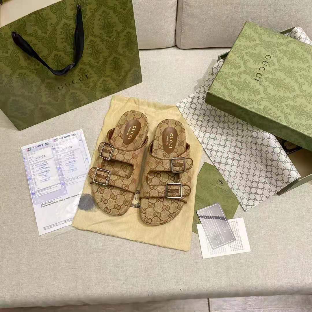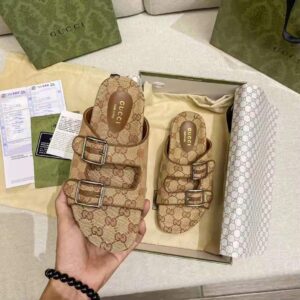 A pair of flat sandals crafted from monogram canvas in beige and ebony.
