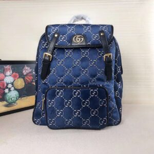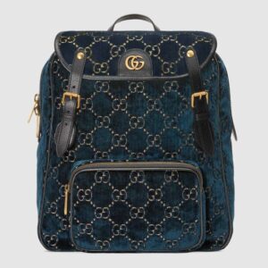 The backpack is presented in a smaller silhouette for Pre-Fall 2019, in dark blue GG velvet with leather trims.