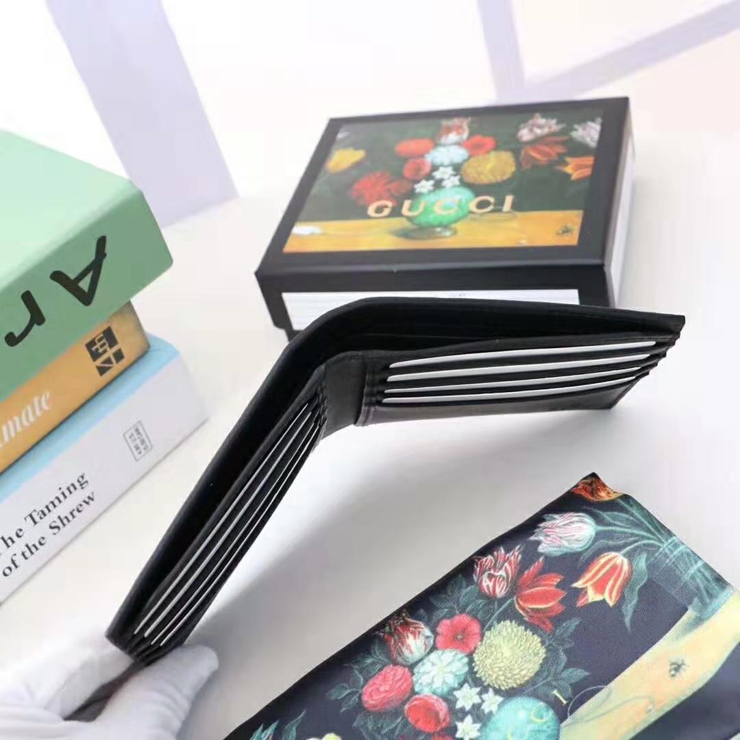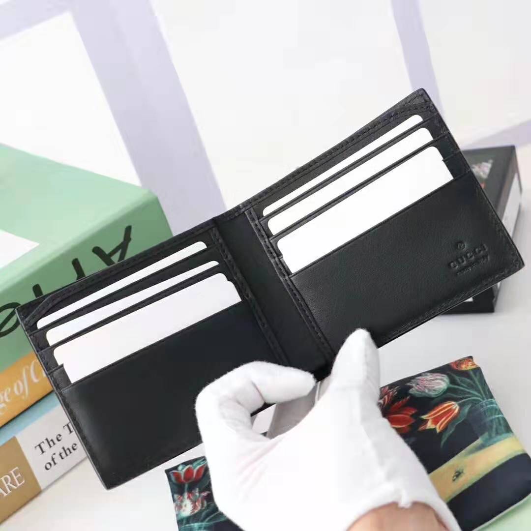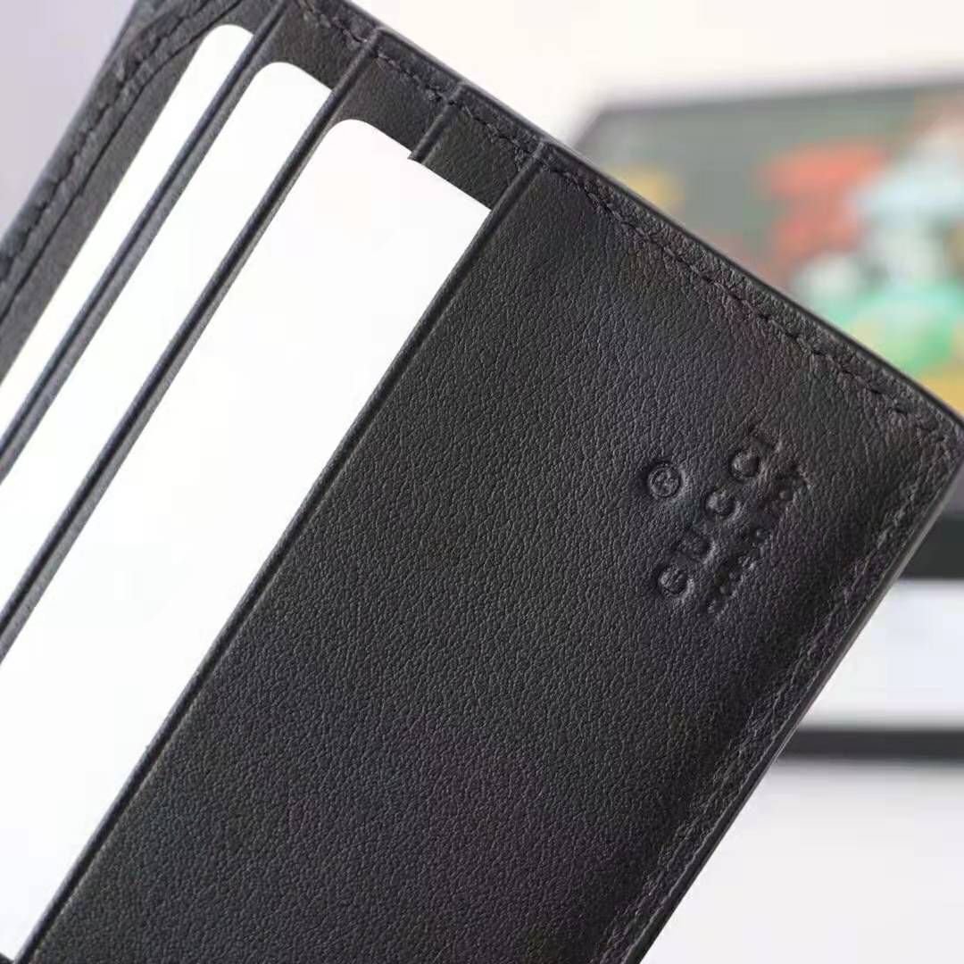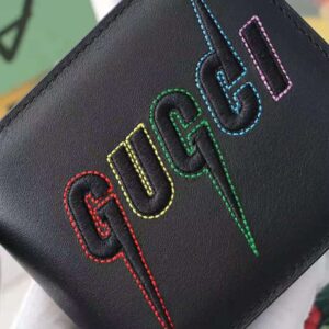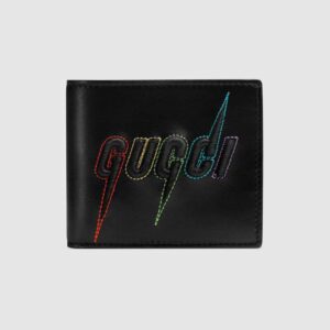 The graphic Gucci Blade logo decorates a smooth leather bi-fold wallet with a raised embossed effect that is then embroidered and outlined with colorful stitching.