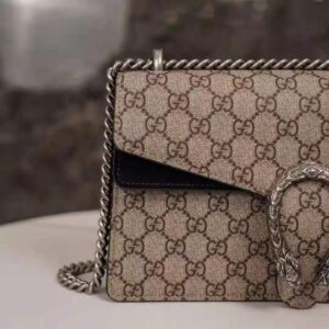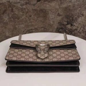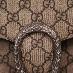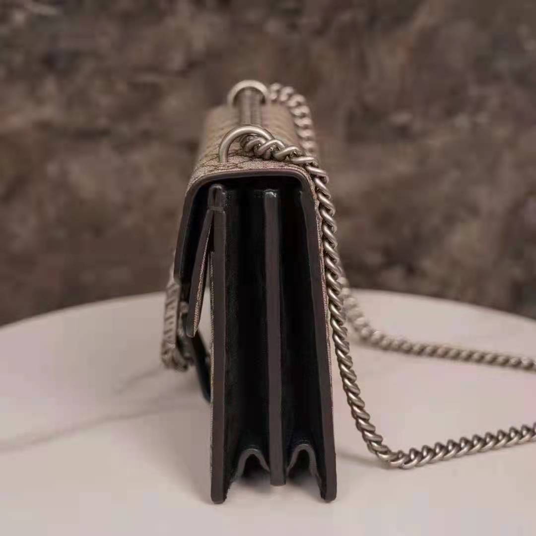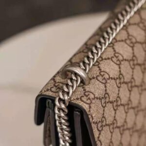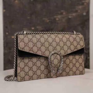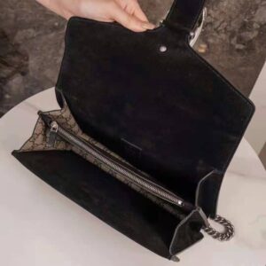 The small Dionysus shoulder bag is presented in the signature GG pattern, trimmed with black suede details.