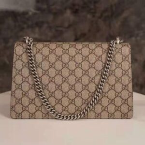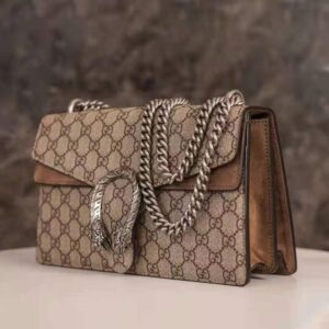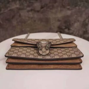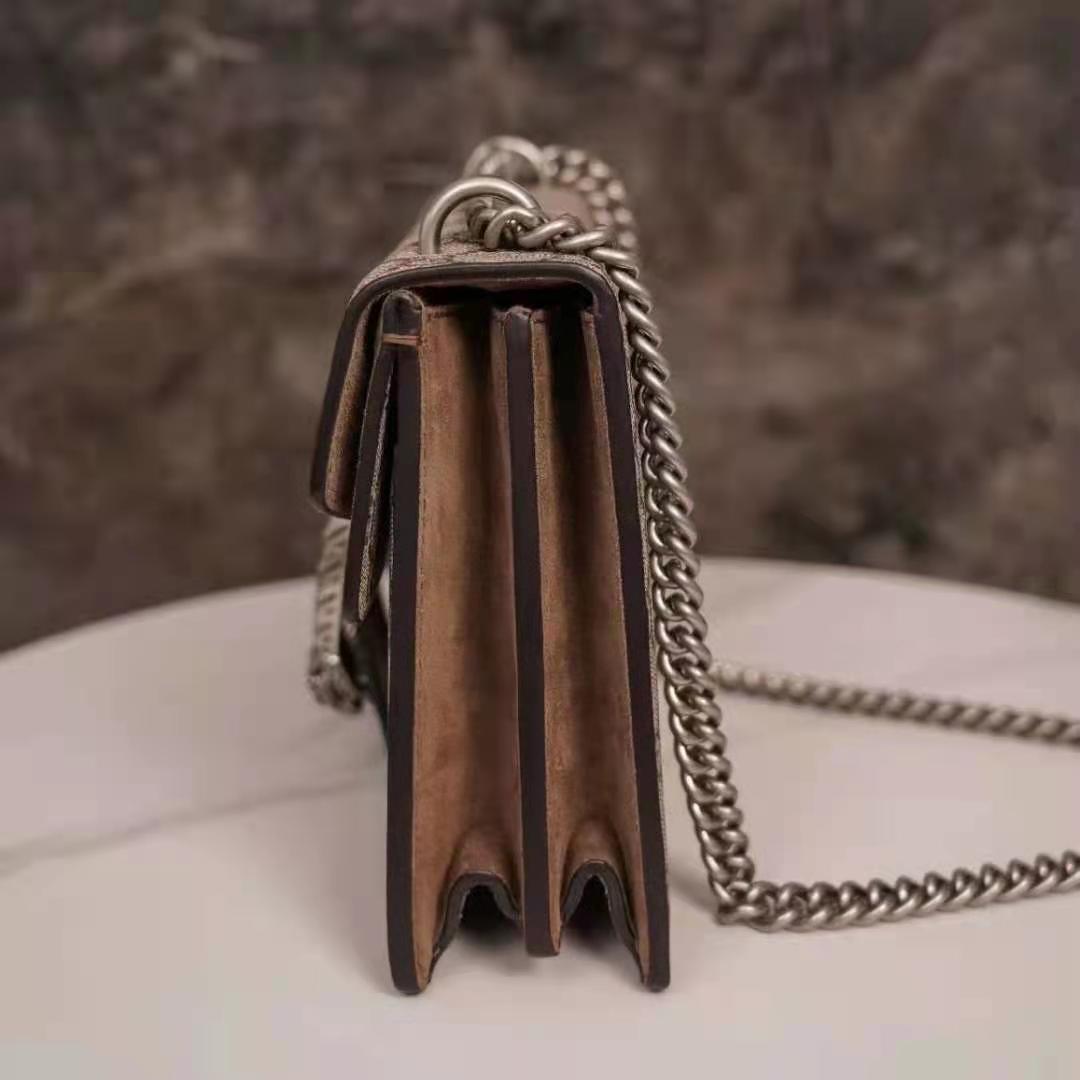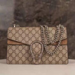 The small Dionysus shoulder bag is presented in the signature GG pattern, trimmed with taupe suede details.