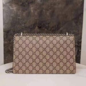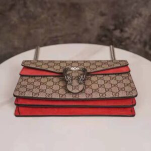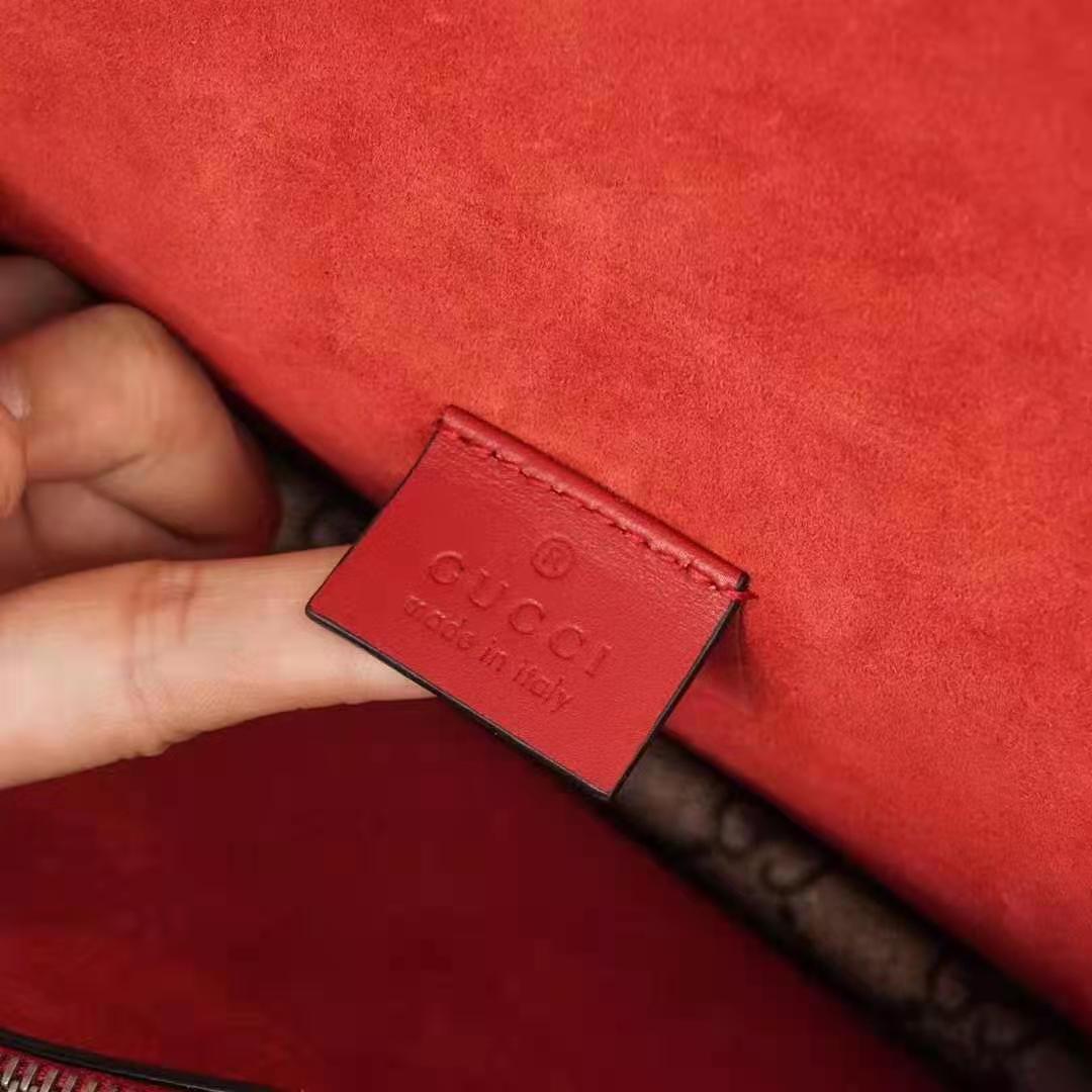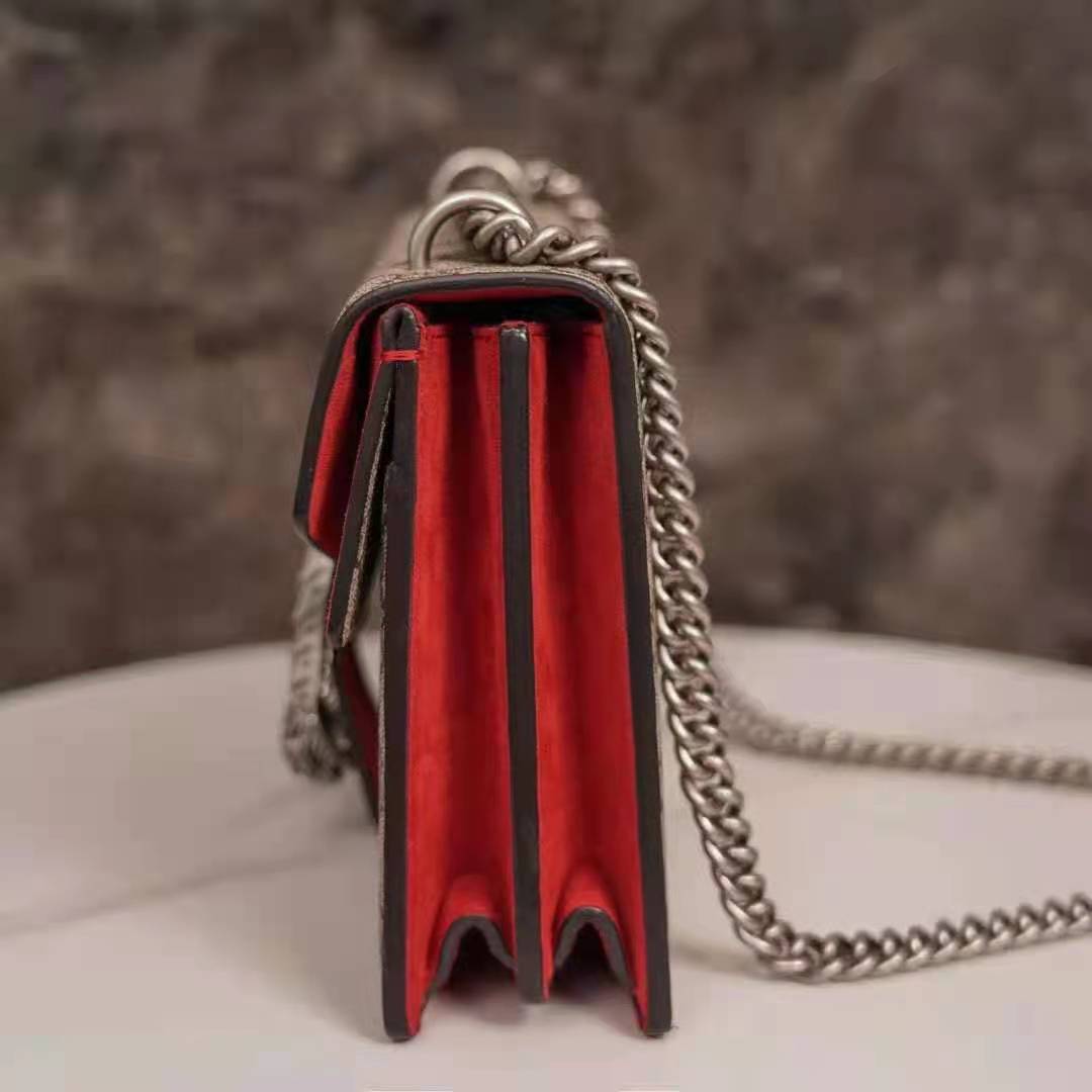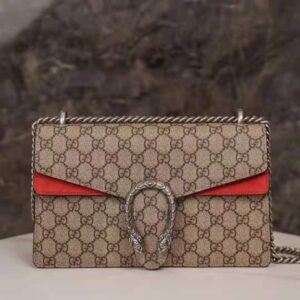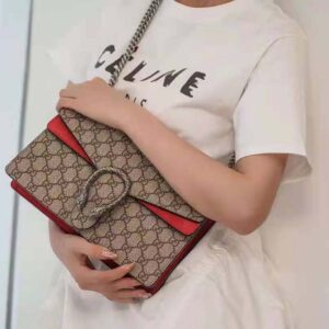 The small Dionysus shoulder bag is presented in the signature GG pattern, trimmed with red suede details.