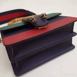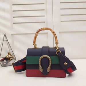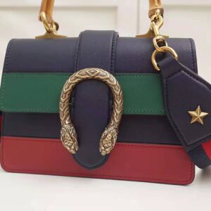 A structured contrast Dionysus bag in leather with the textured tiger head spur closure-a unique detail referencing the Greek god Dionysus, who in myth is said to have crossed the river Tigris on a tiger sent to him by Zeus.
