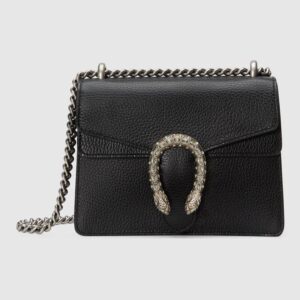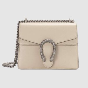 The Dionysus mini bag is presented in white textured leather with the now defining tiger head closure.