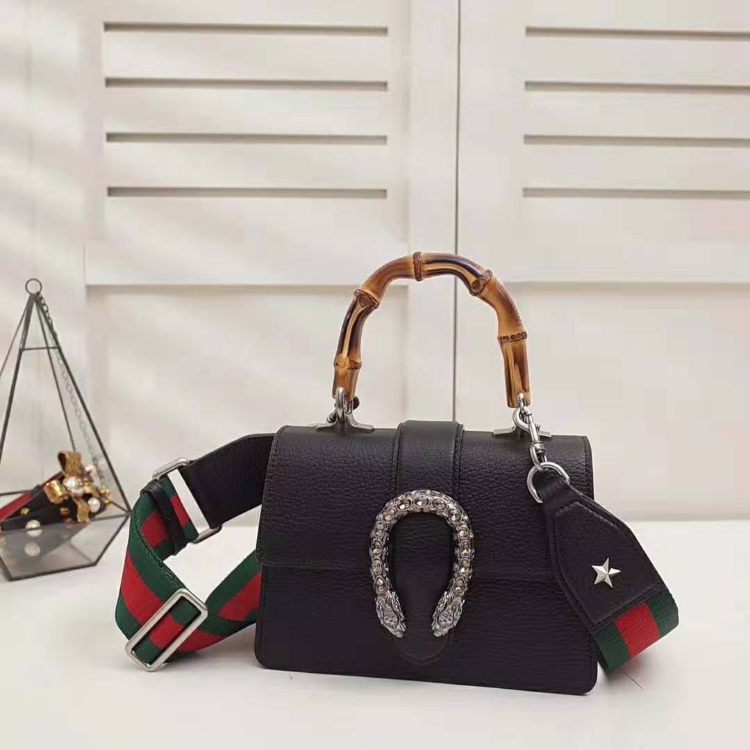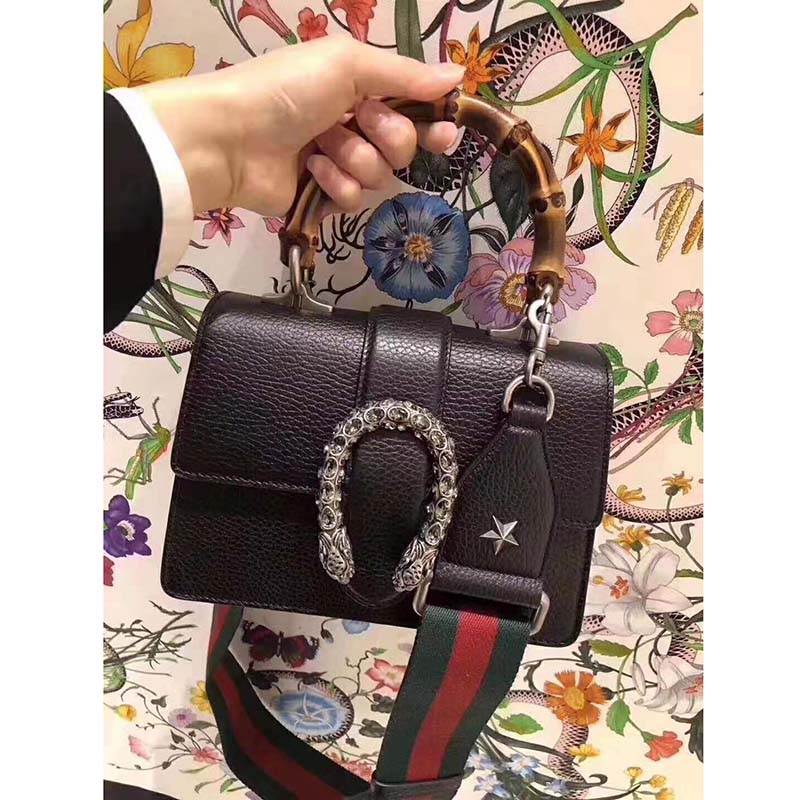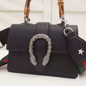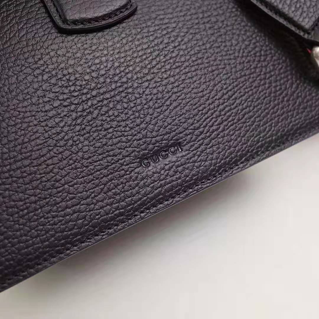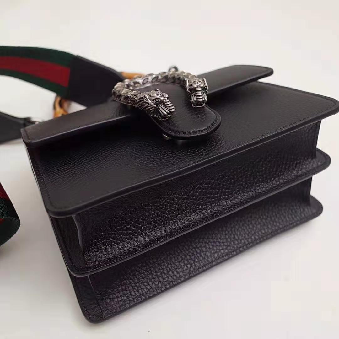 Presented in a new, mini size for Pre-Fall 2018, this Dionysus bag in textured black leather is defined by the tiger head spur closure-a unique detail referencing the Greek god Dionysus, who in myth is said to have crossed the river Tigris on a tiger sent to him by Zeus.