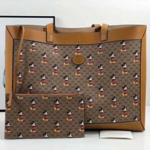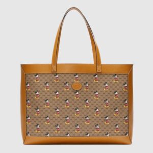 Mickey Mouse’s playful image defines this GG canvas tote bag, trimmed with light brown leather details that convey a vintage look and feel.