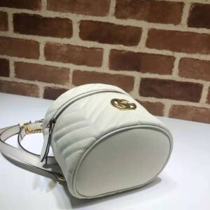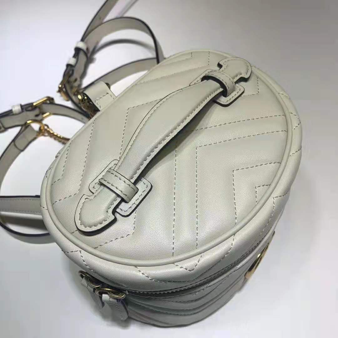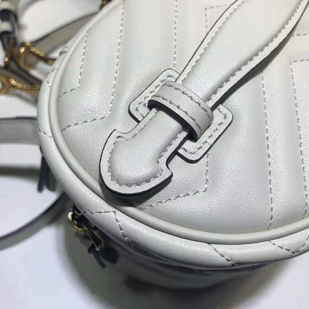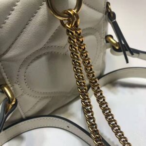 The mini backpack has a contemporary rounded shape in white matelassé leather, completed with chain shoulder straps and a top handle.