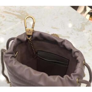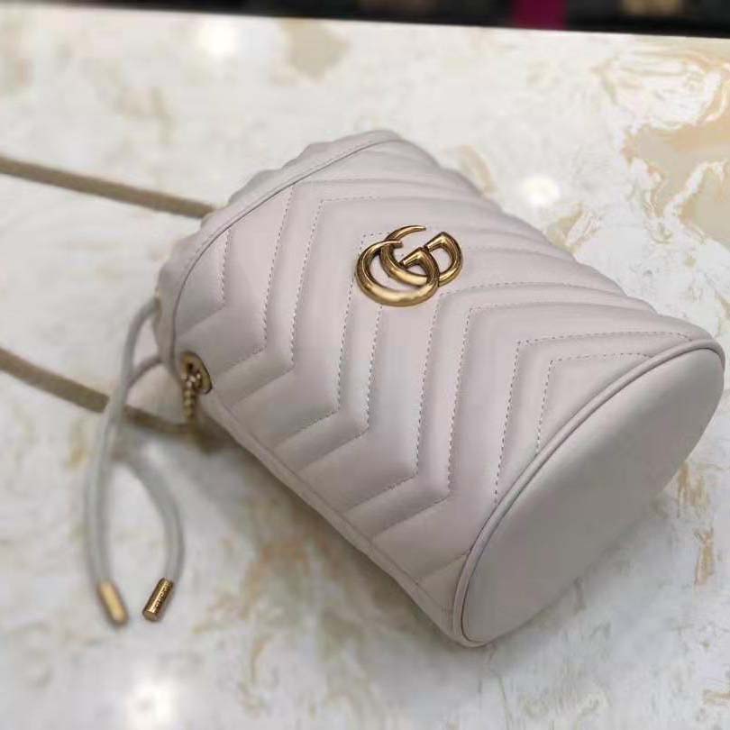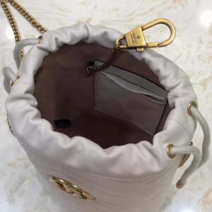 A mini bucket bag presented in white matelassé leather with a heart detail on the back.