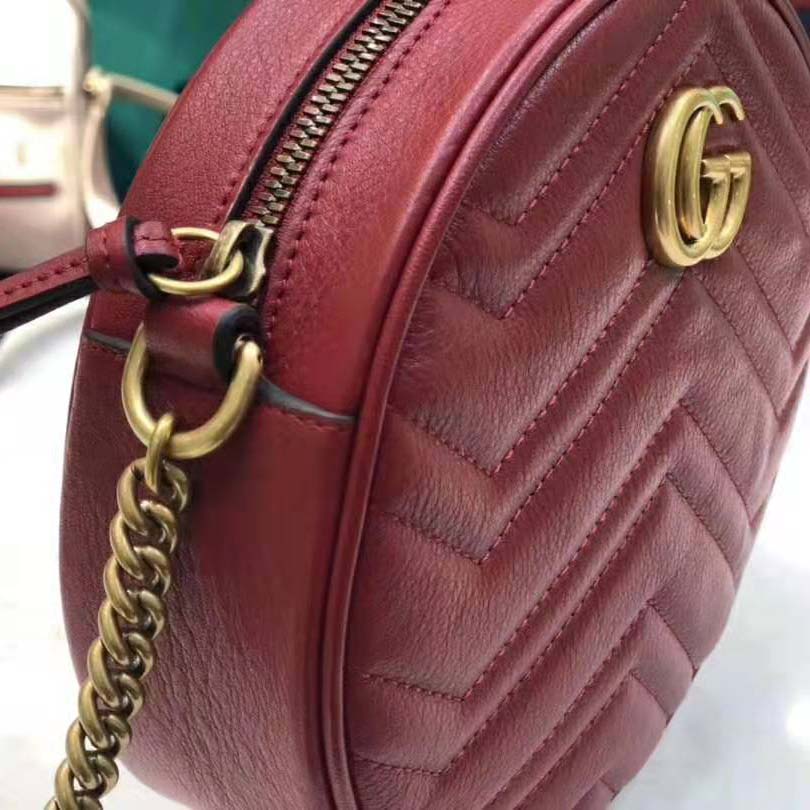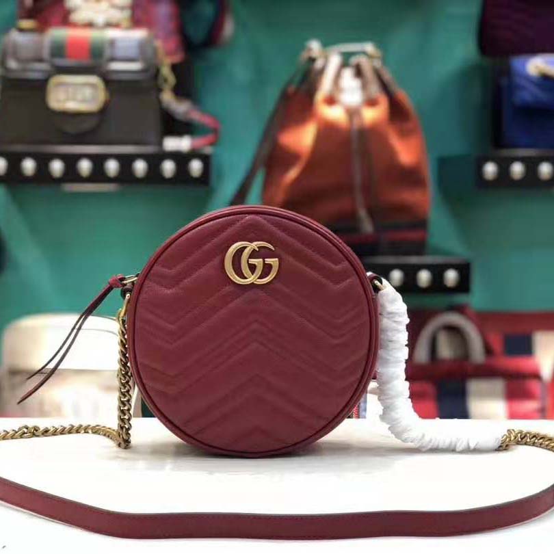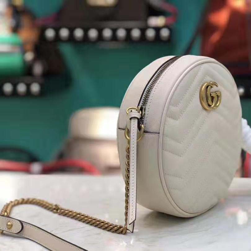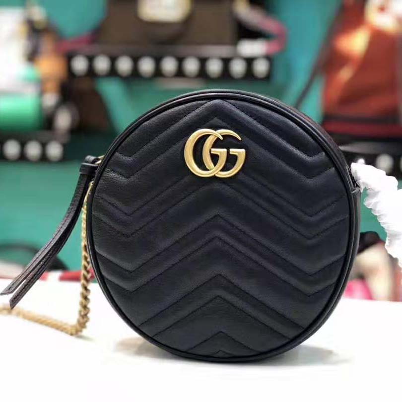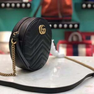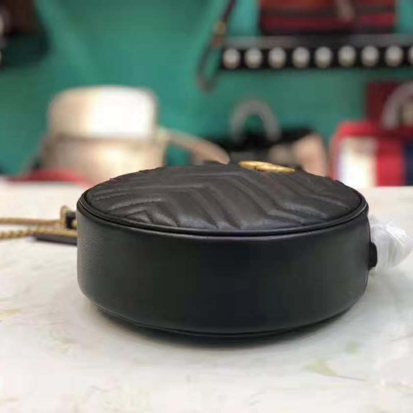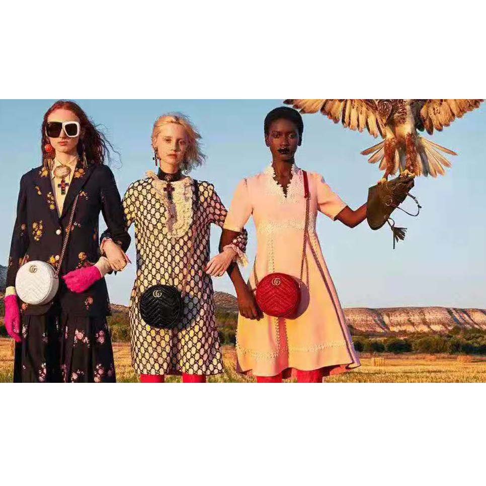 A new introduction to the GG Marmont line for Cruise 2019, the mini bag is presented in a rounded shape with a chain shoulder strap.