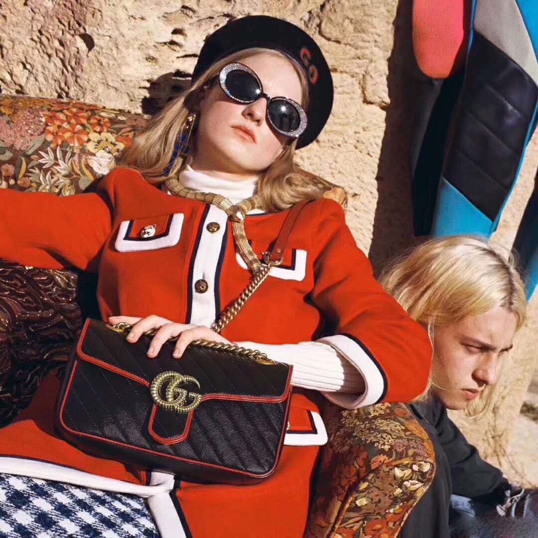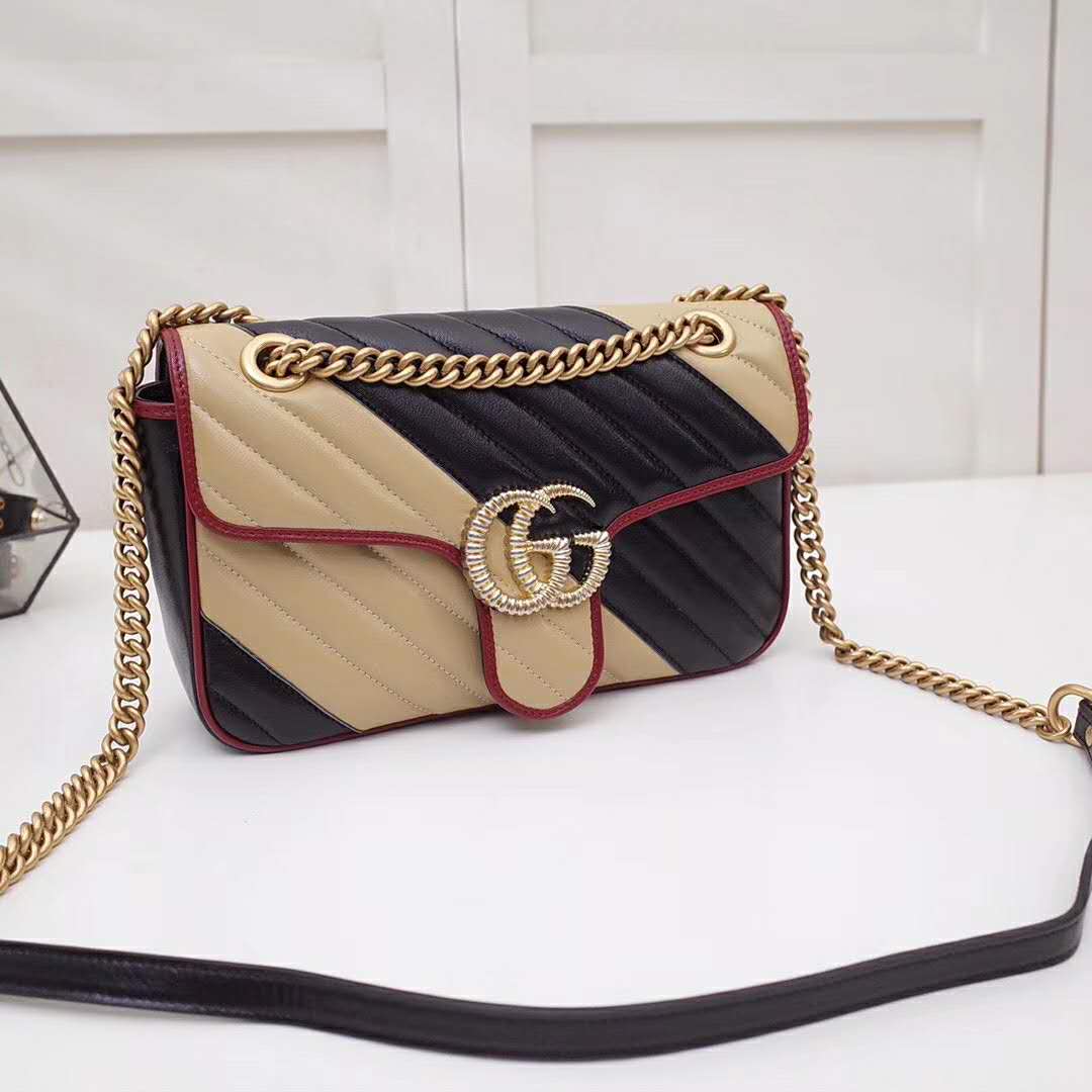 The GG Marmont small shoulder bag is reimagined in black and beige diagonal matelassé quilted leather, speaking to the theme of bold stripes that runs throughout the Pre-Fall 2019 collection.
