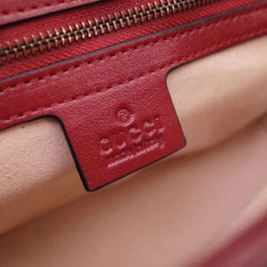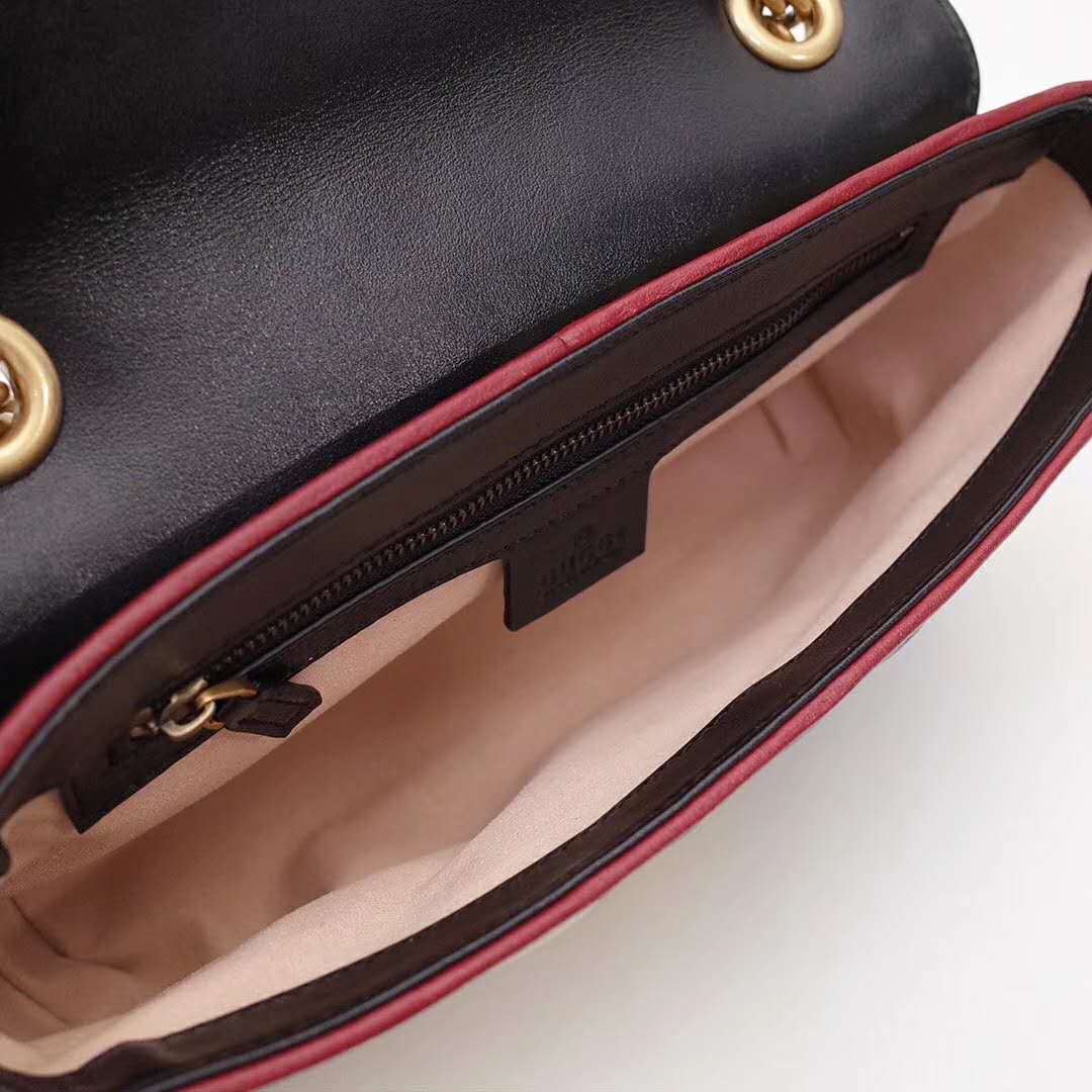 Completed with a twisted torchon Double G embellishment, the small chain shoulder bag’s distinct softly structured shape is outlined in contrast cerise piping, highlighting its flap closure. The sliding chain strap smoothly transforms from a single shoulder length to a doubled top handle length for multiple ways to wear the bag.