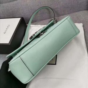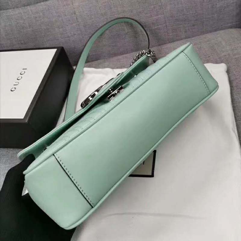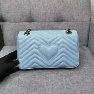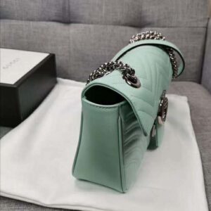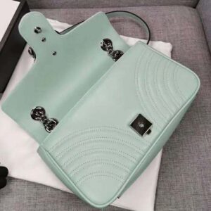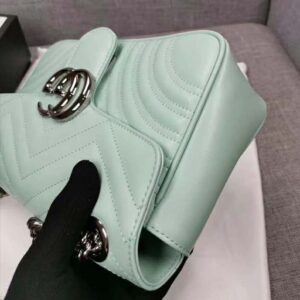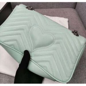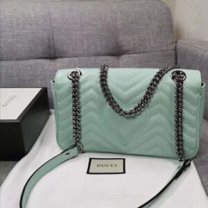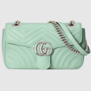 Made in matelassé chevron leather with a heart on the back in a light shade of green, the now recognizable small GG Marmont chain shoulder bag has a softly structured shape and a flap closure with Double G hardware.