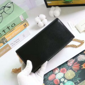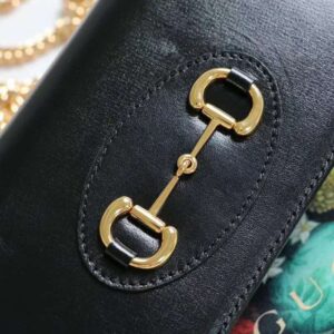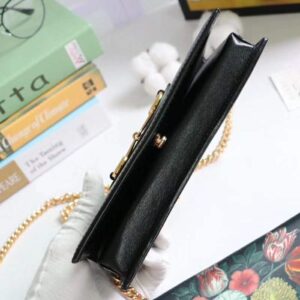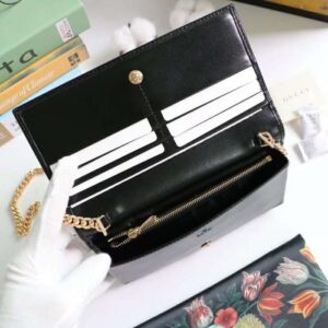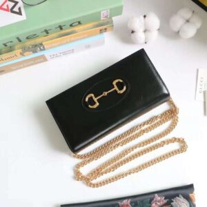 The chain wallet in black leather is introduced as part of the Gucci 1955 Horsebit accessories collection, defined by the double ring and bar design also found in Handbags.