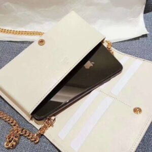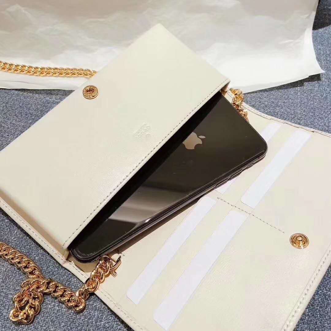 The folded snap-closure shape features several card slots and pockets, completed with a detachable chain strap.