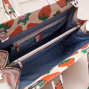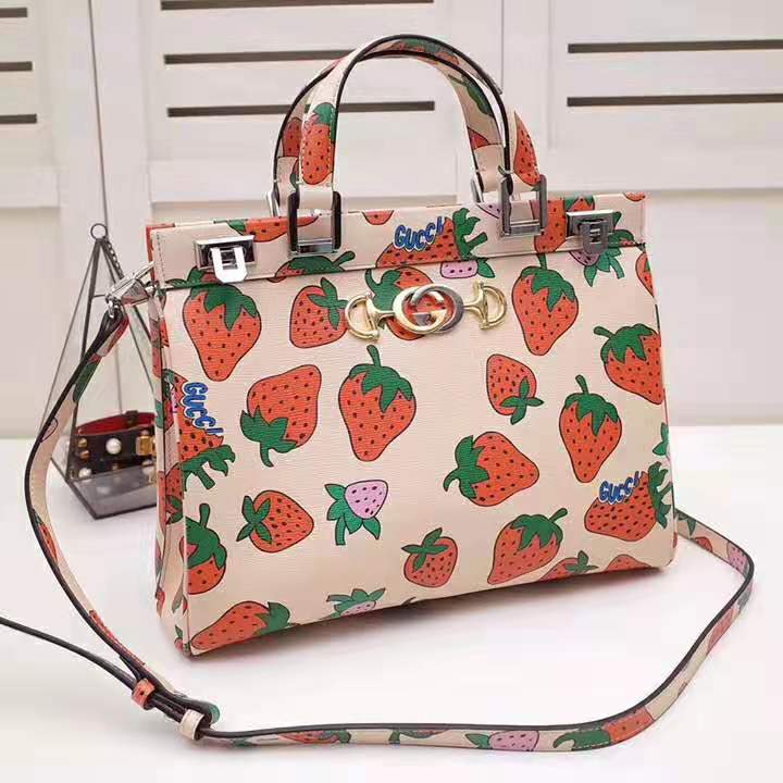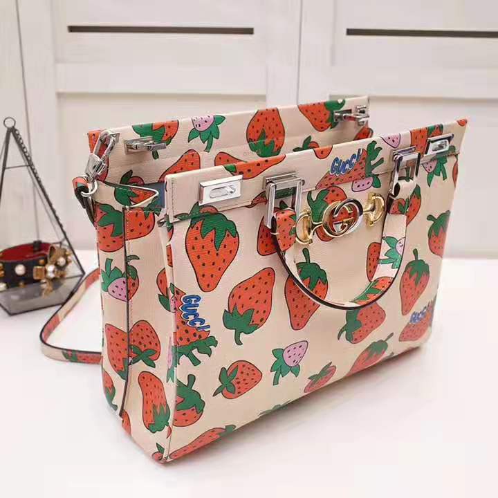 Gucci GG Women Gucci Zumi Strawberry Print Medium Top Handle Bag in Gucci Strawberry Print Ivory Leather