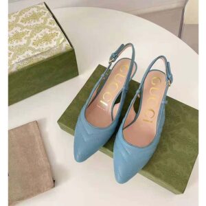 Emblematic of the House’s designs, this pair of sling back pumps is crafted from blue matelassé leather with a chevron motif.