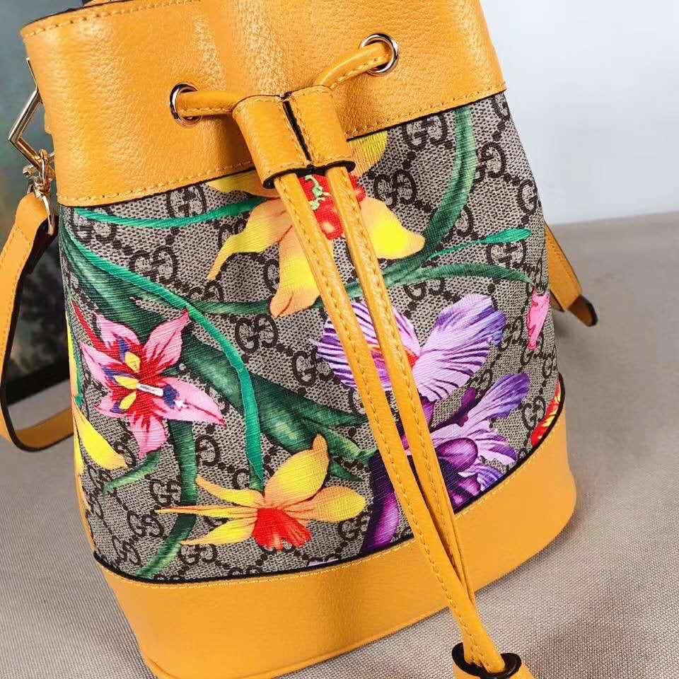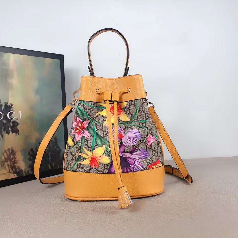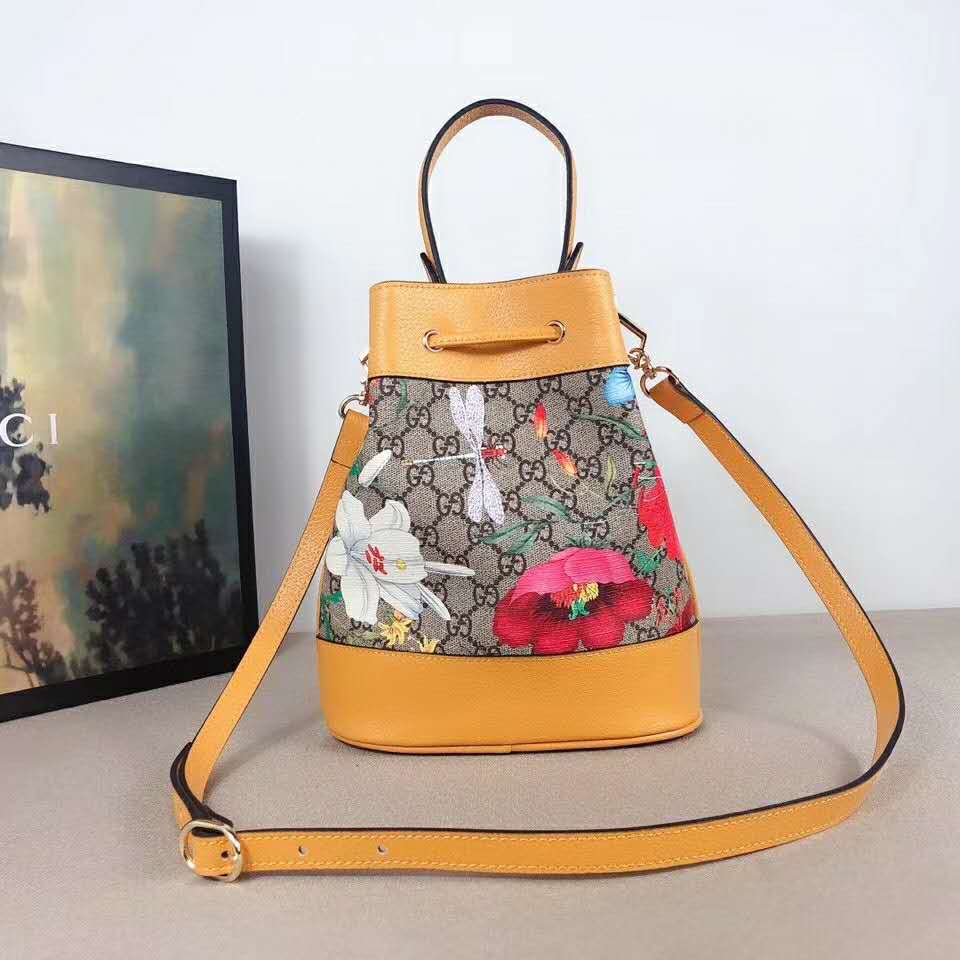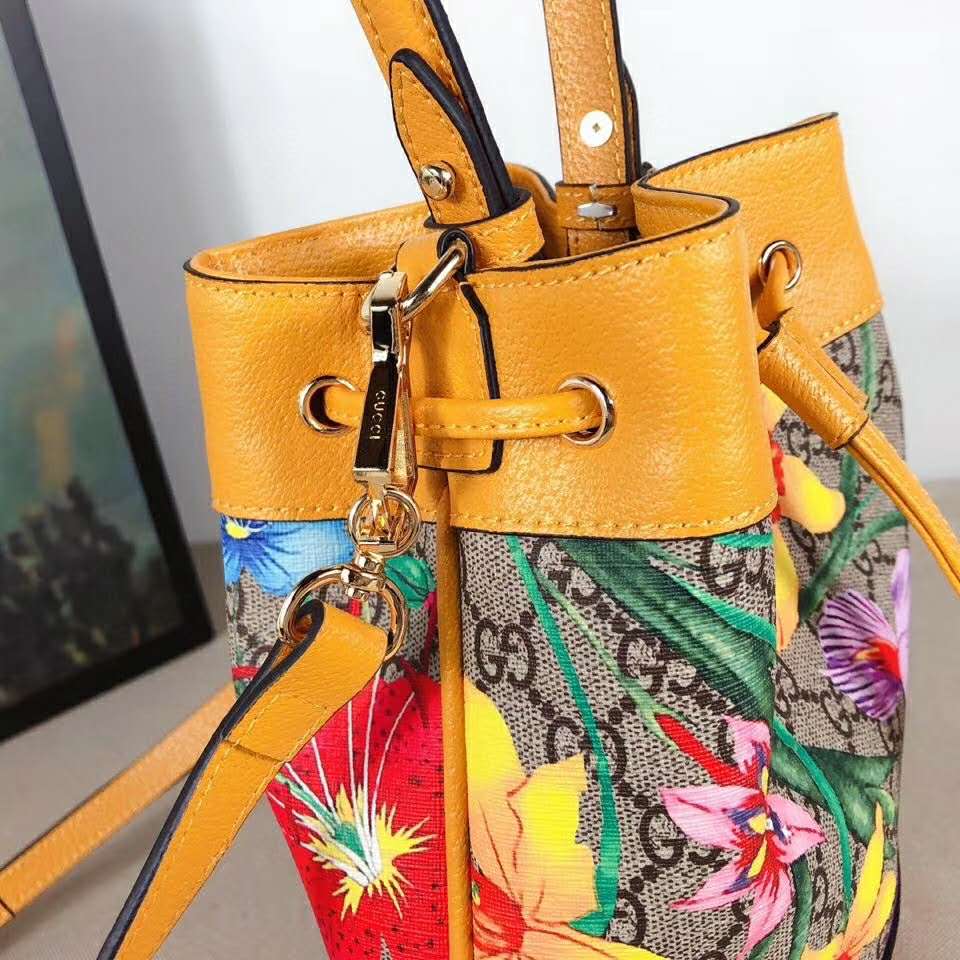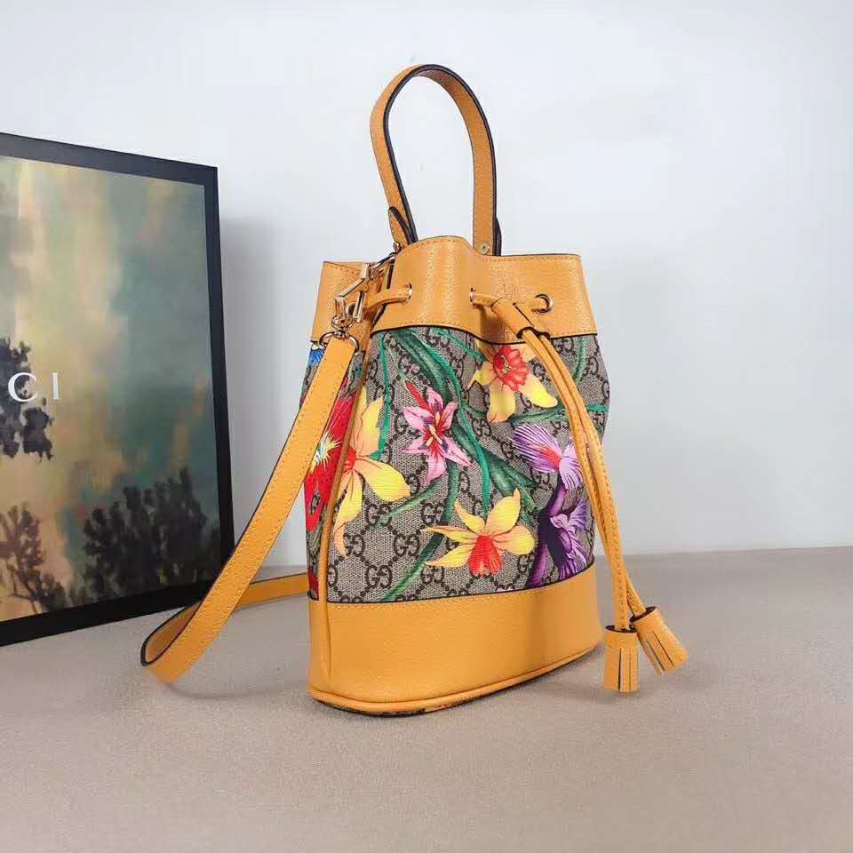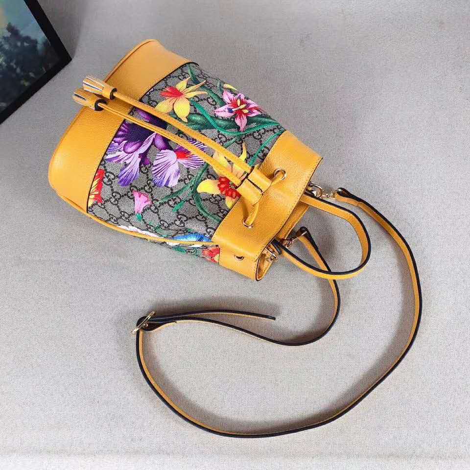 Beige/ebony GG Supreme canvas with Flora print, a material with low environmental impact, with yellow leather trim