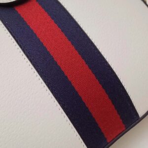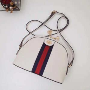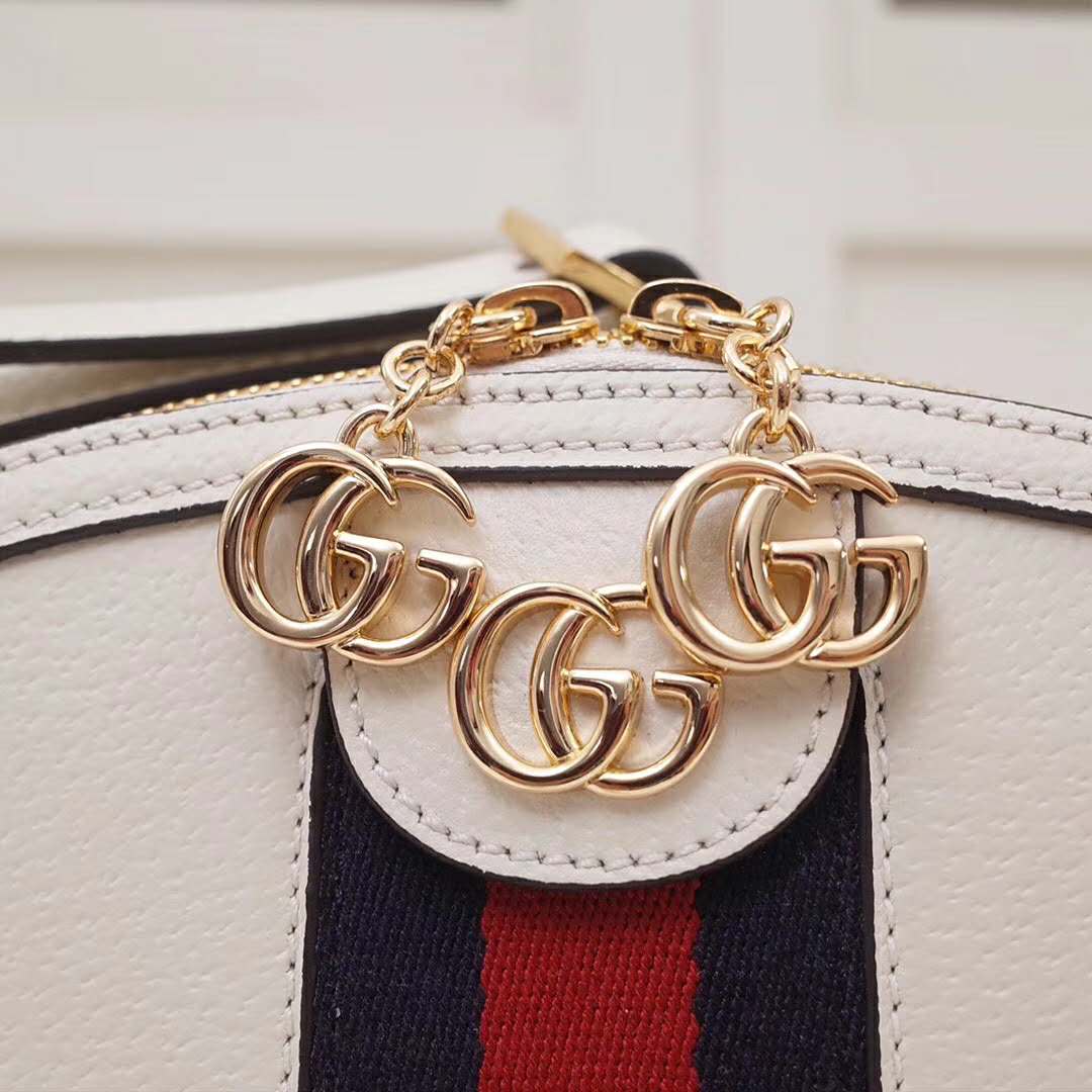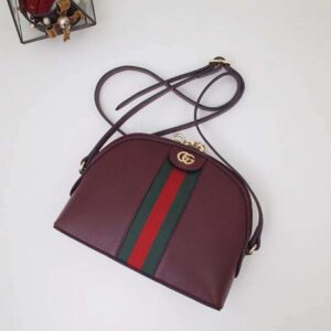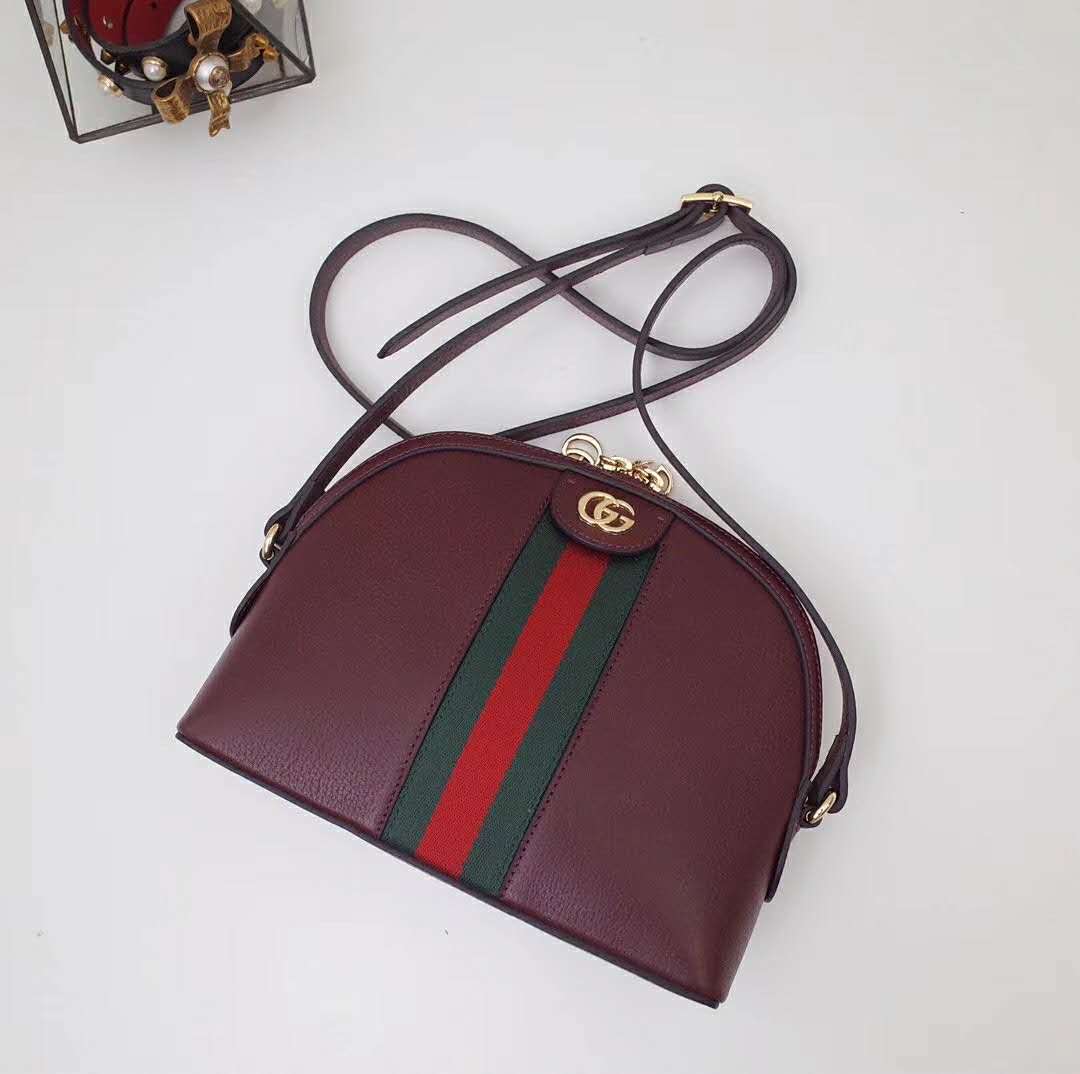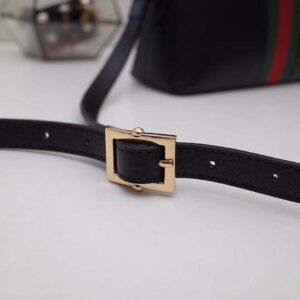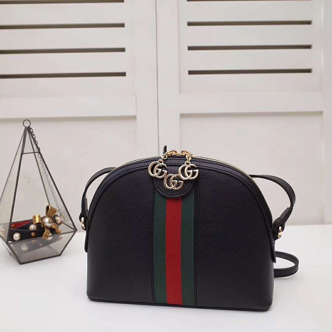 The rounded top Ophidia shoulder bag is introduced in a new iteration for Pre-Fall 2019, crafted from black leather with inlaid green and red Web stripe.