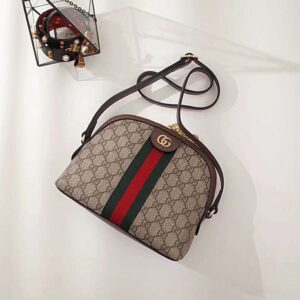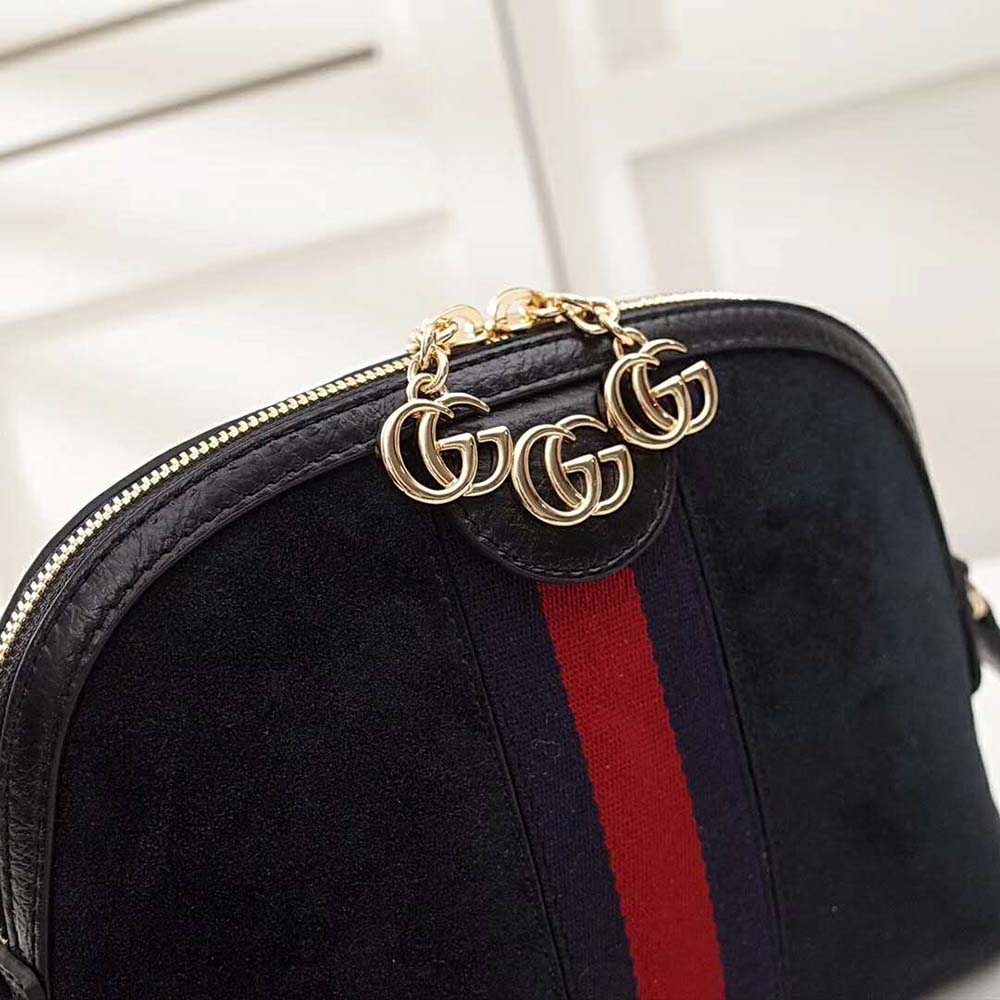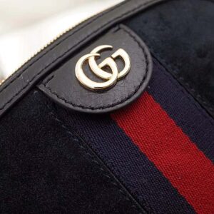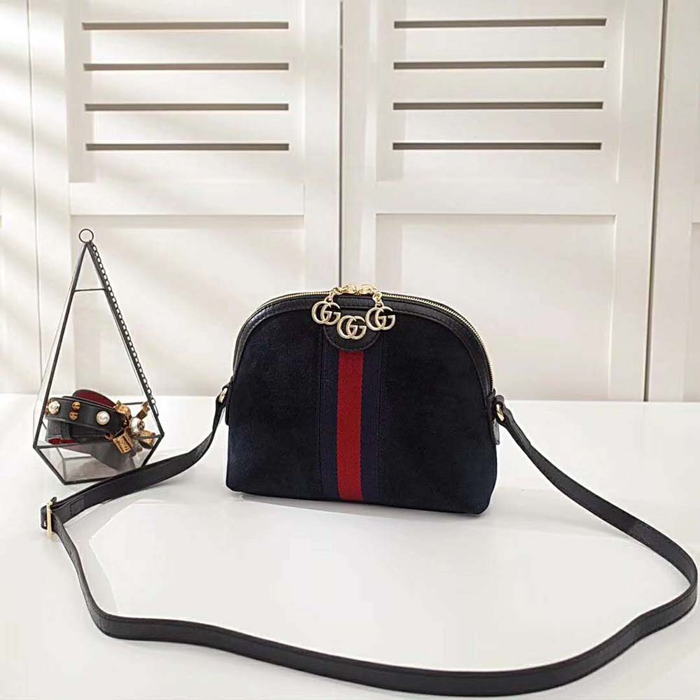 Crafted in blue suede with inlaid blue and red Web stripe, this Ophidia shoulder bag has a vintage-inspired domed shape, presented in a chromatic combination that plays with emblematic colors of the House.