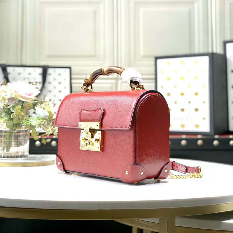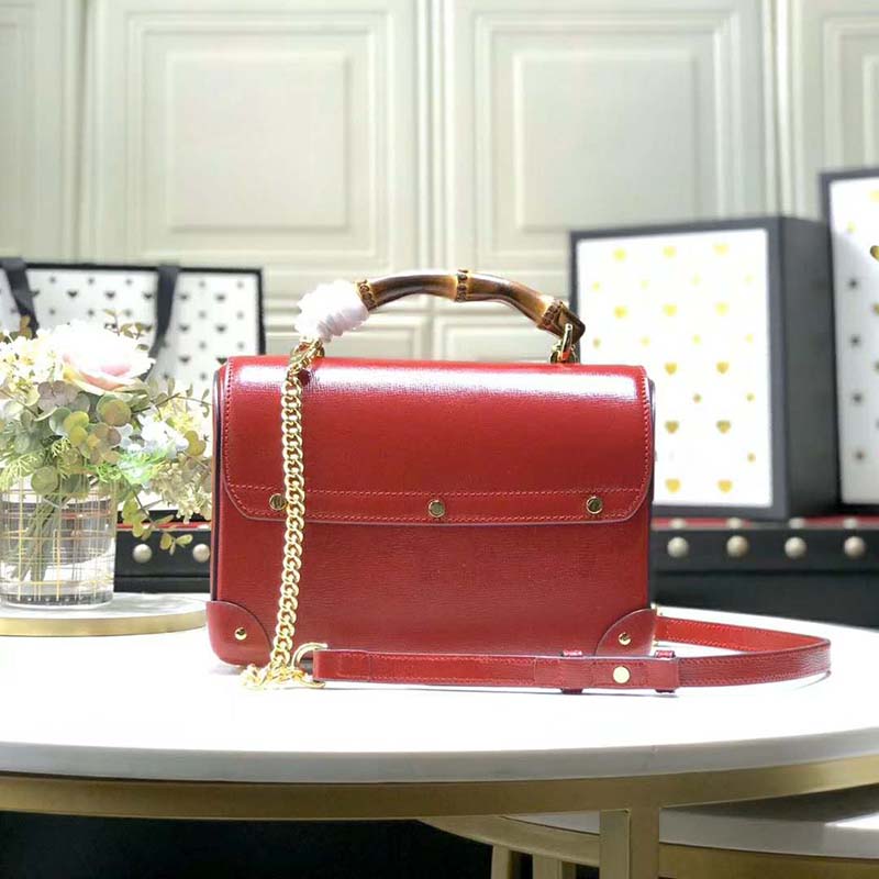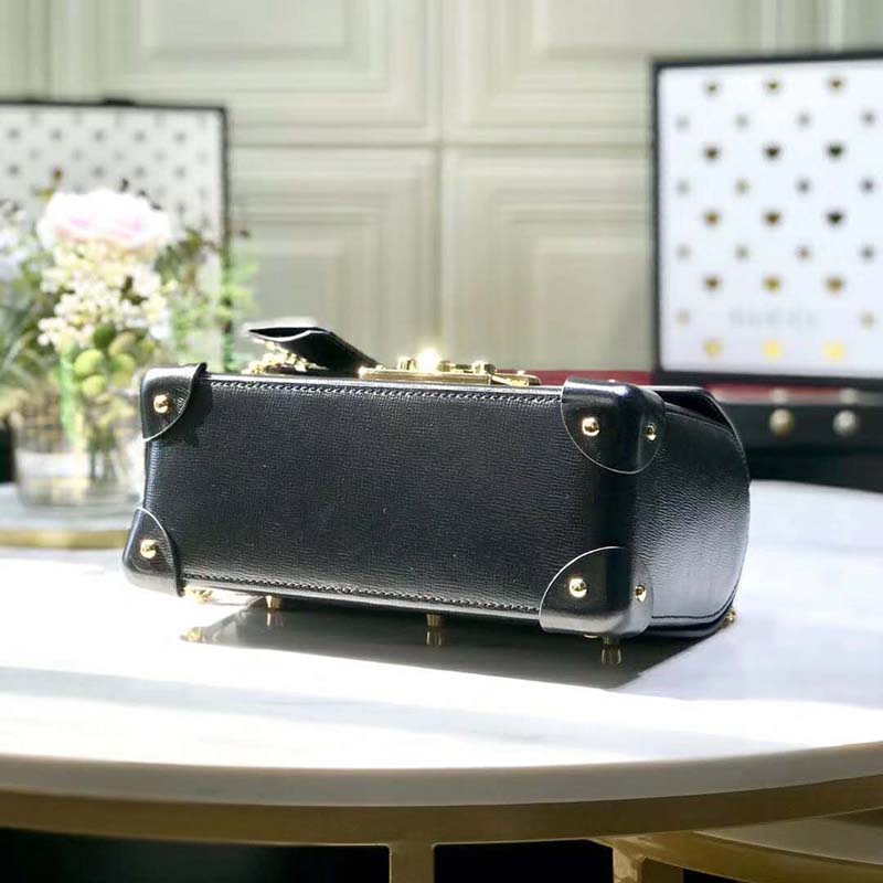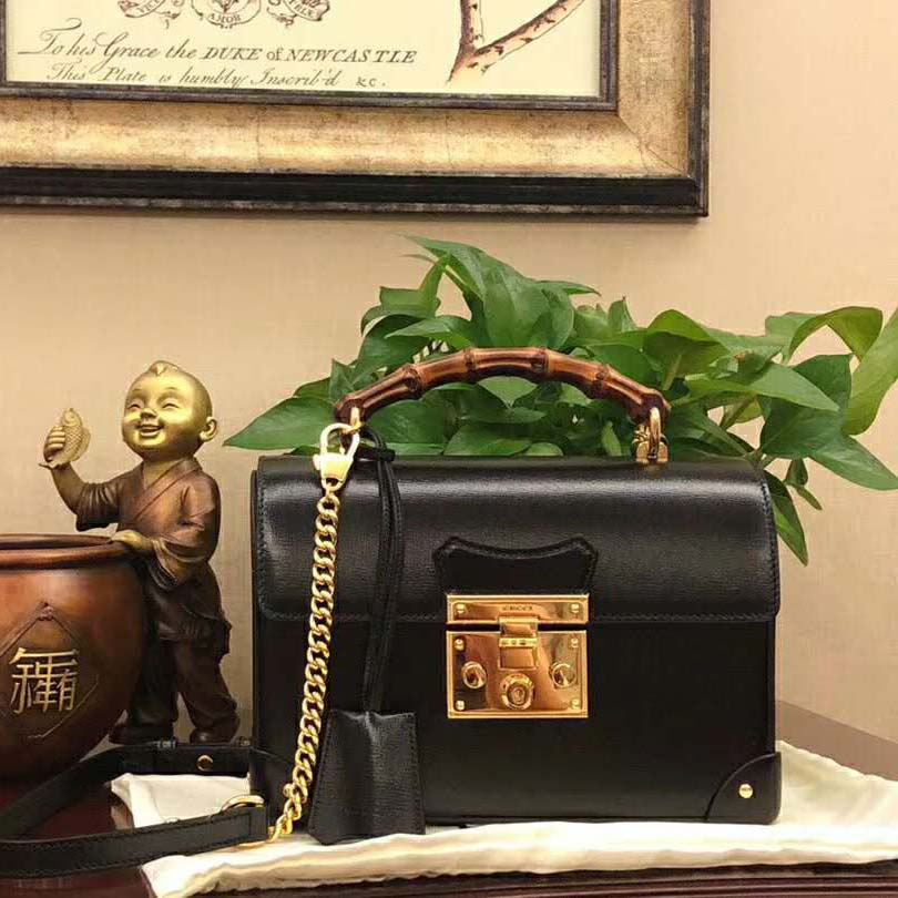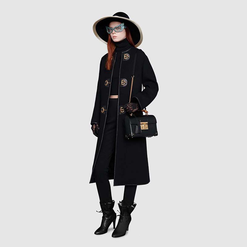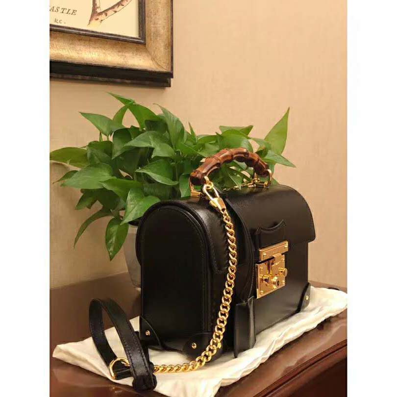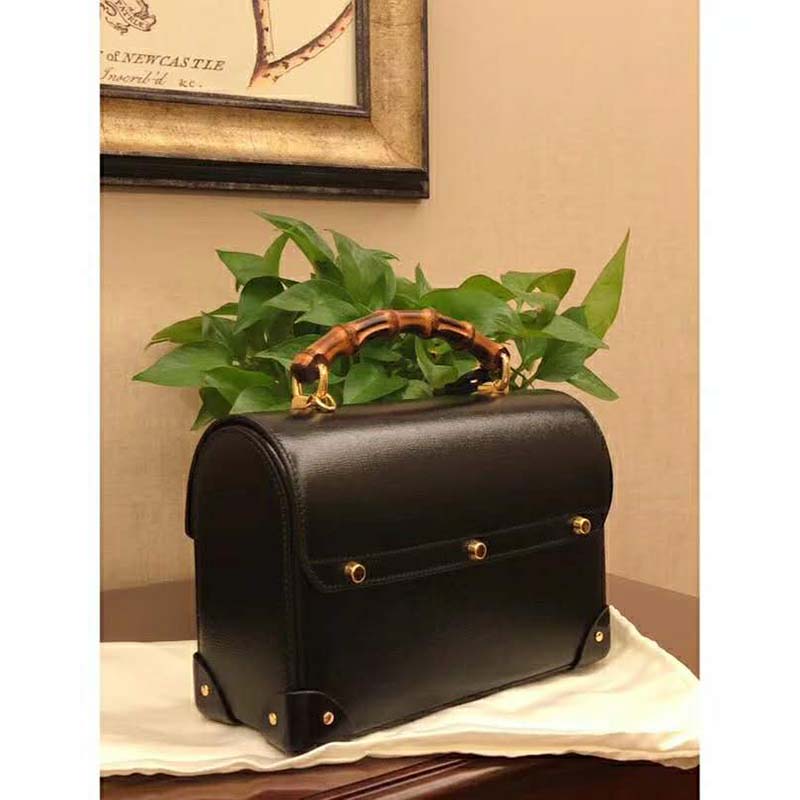 Archival details, including the bamboo handle and closure, combine in a modern silhouette in the small shoulder bag, crafted from textured black leather.
