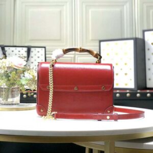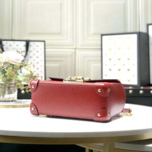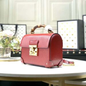 The structured shape has a flap closure that locks with a key kept in a removable leather holder. The top handle shape is further enriched with a removable chain and leather shoulder strap.