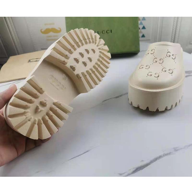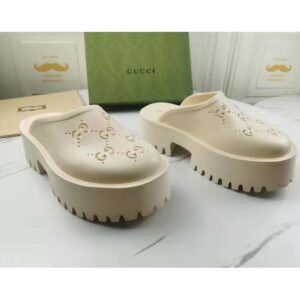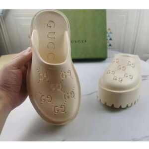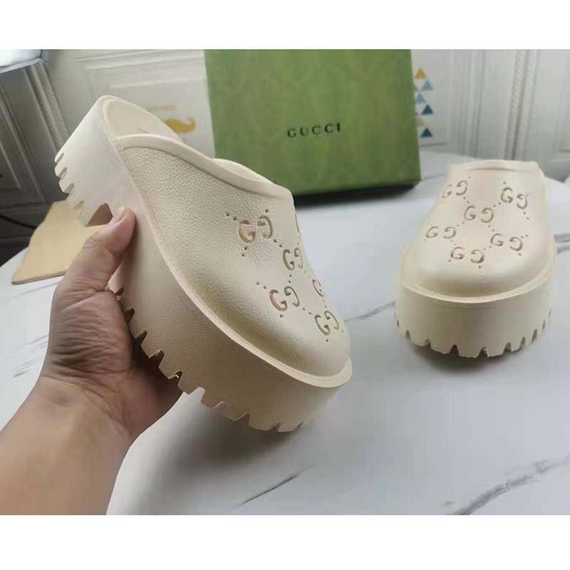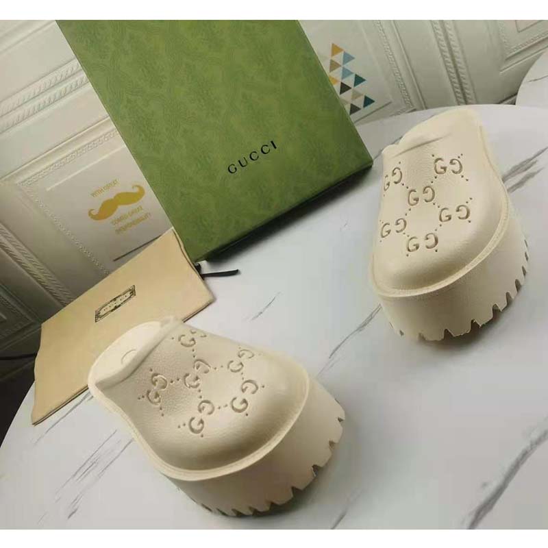 Here, the monogram appears as a cut out motif atop these white rubber sandals.