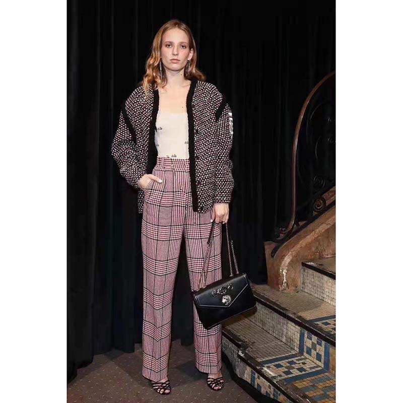 A tiger head decorated with crystals and colored enamel completes the front, recalling a vintage brooch by Hattie Carnegie—a legendary jewelry and fashion designer in the 1920s-1950s.