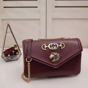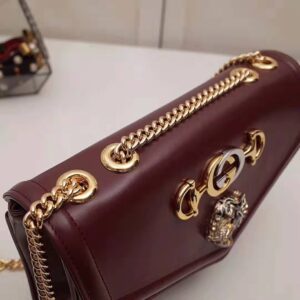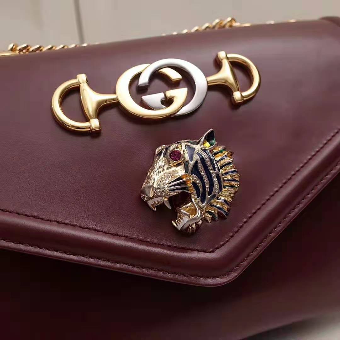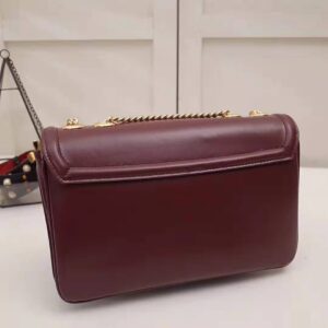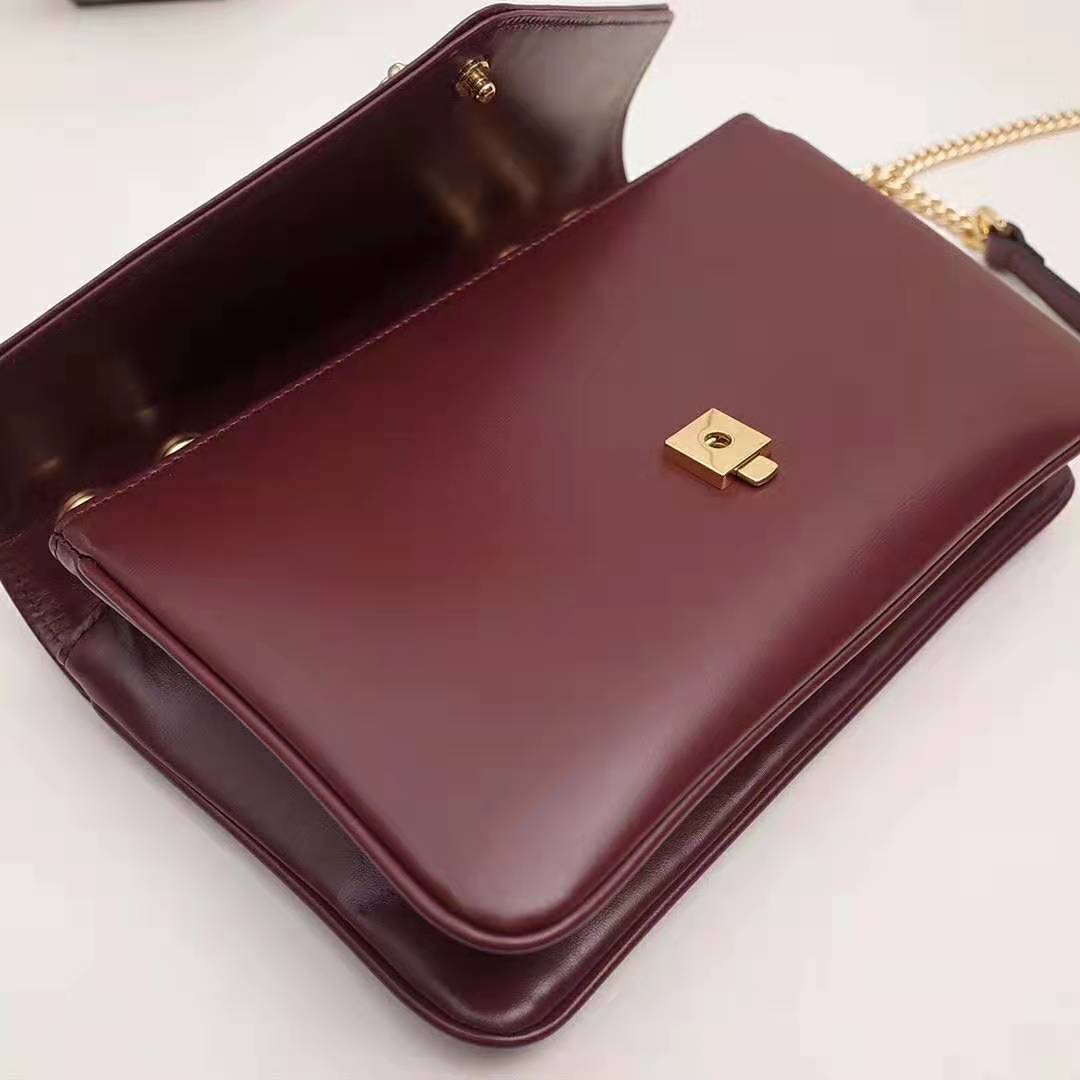 With a retro-inspired shape, the burgundy leather shoulder bag features a hybrid symbol, merging two of the House’s most distinctive codes: the Horsebit and the Interlocking G.