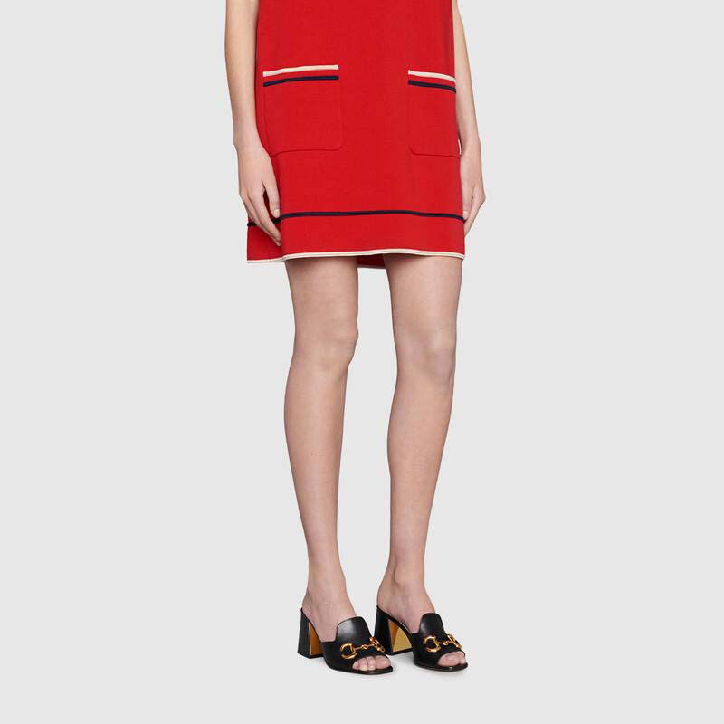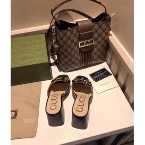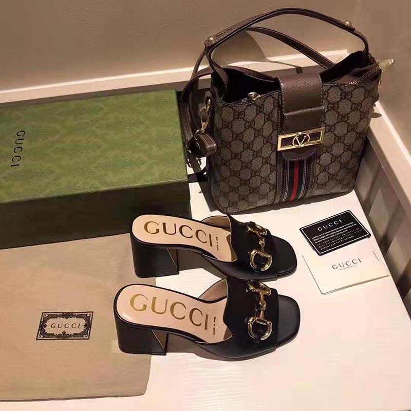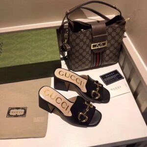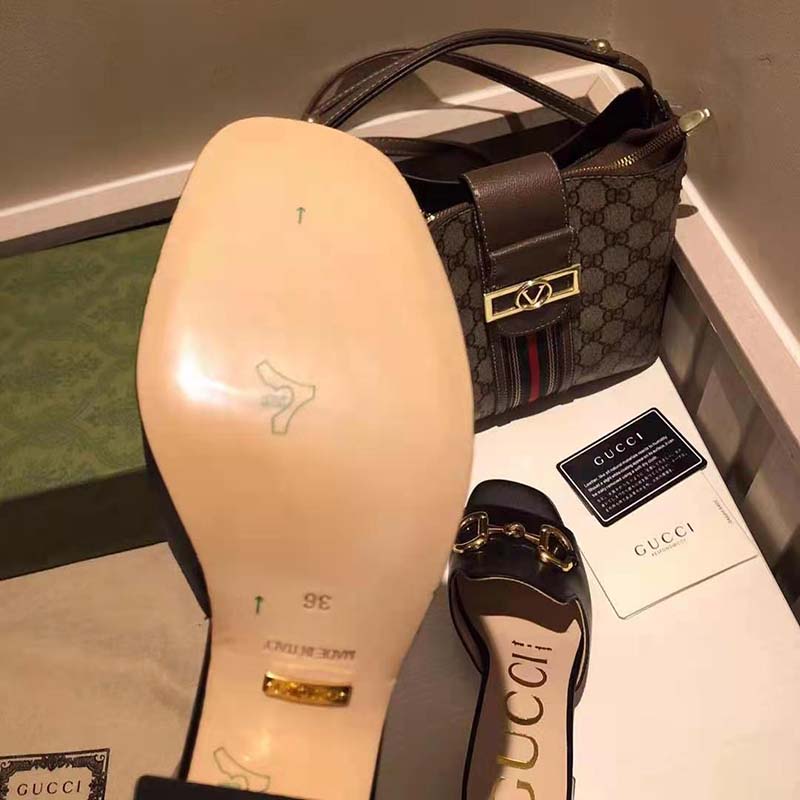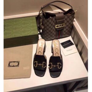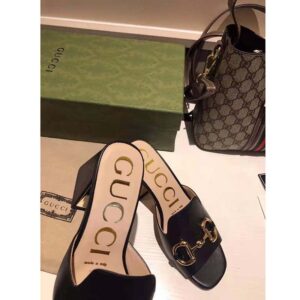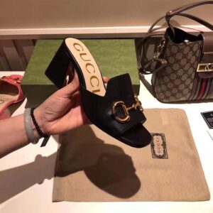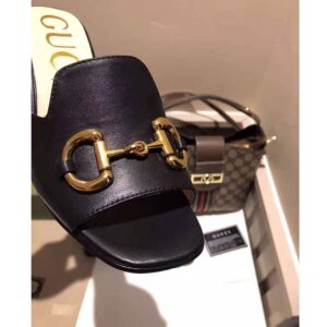 Crated from smooth black leather, this slide sandal is accentuated by a retro-inspired block heel and the House’s emblematic Horsebit hardware.