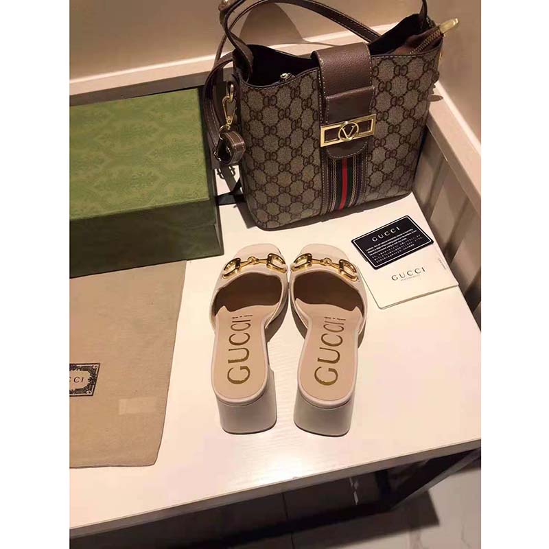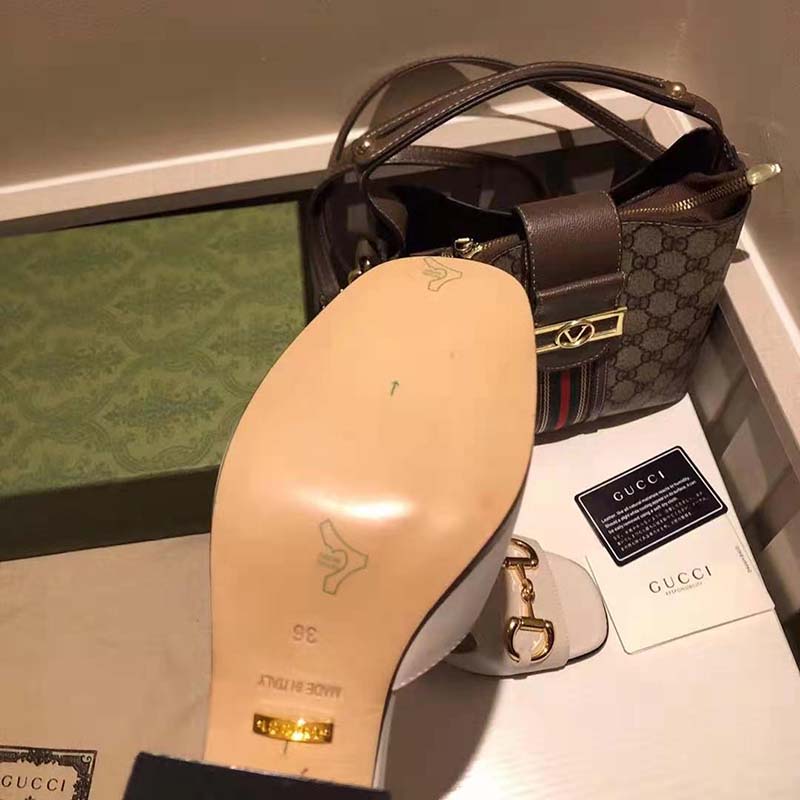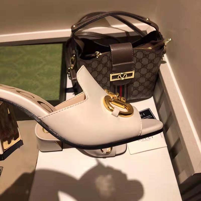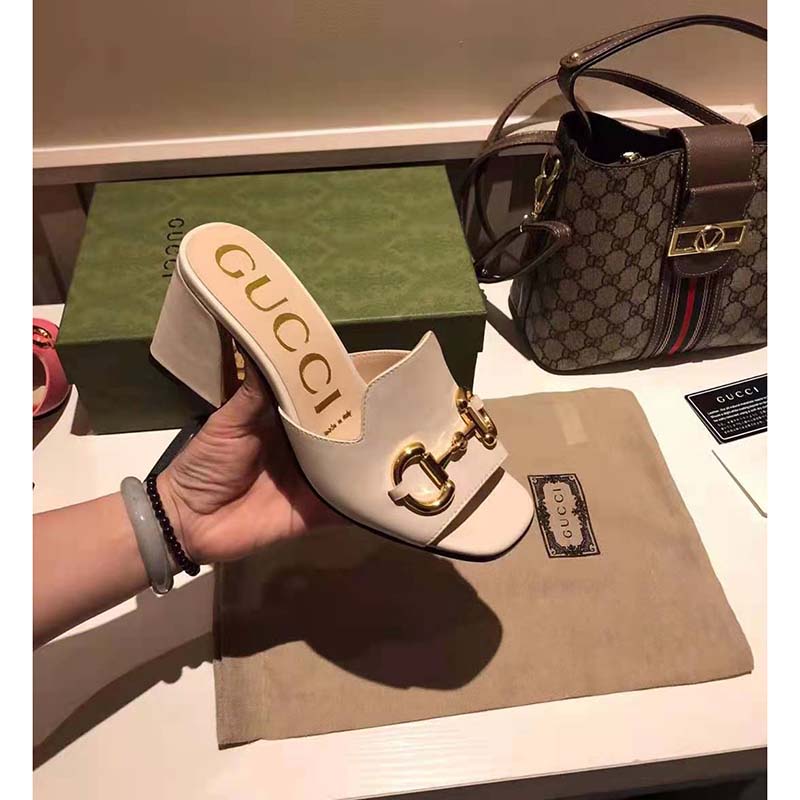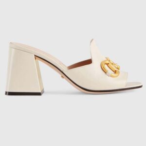 Crated from smooth white leather, this slide sandal is accentuated by a retro-inspired block heel and the House’s emblematic Horsebit hardware.