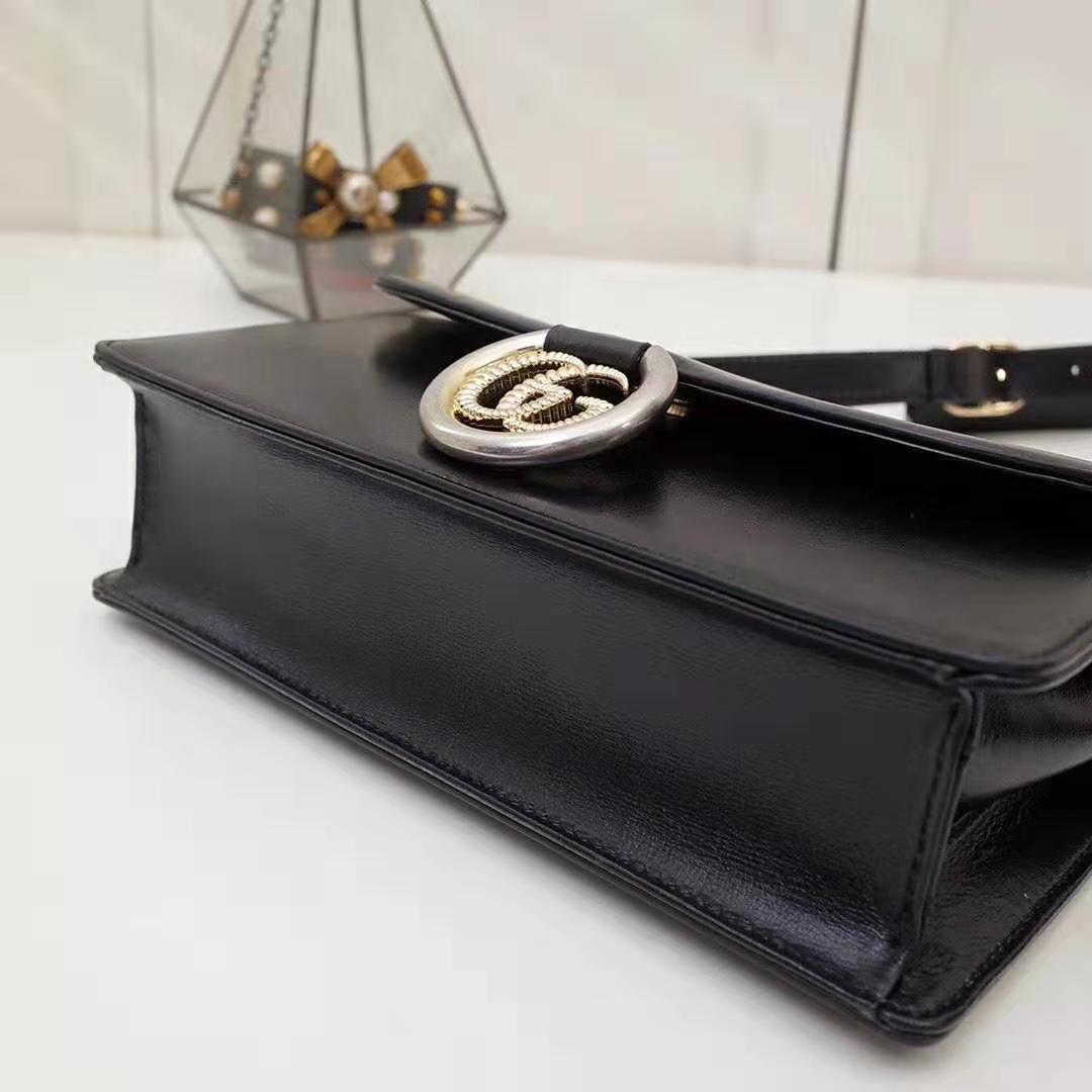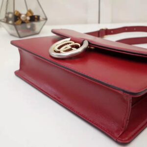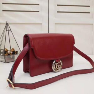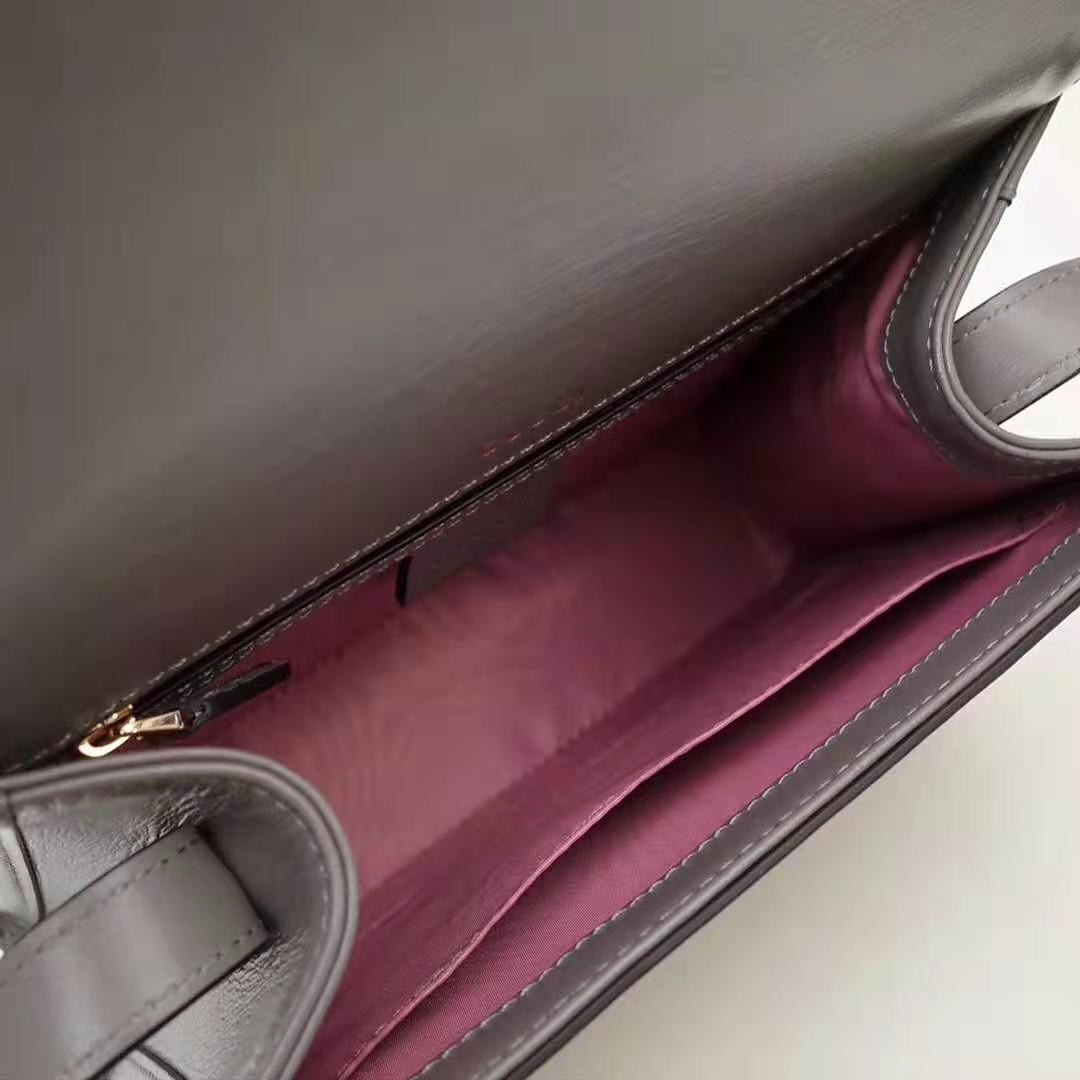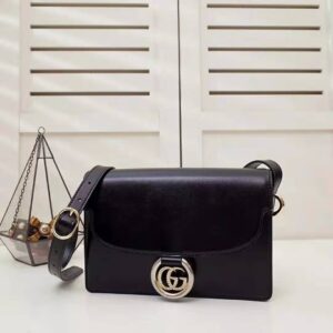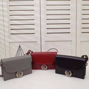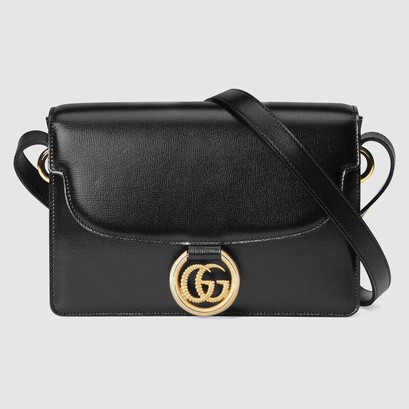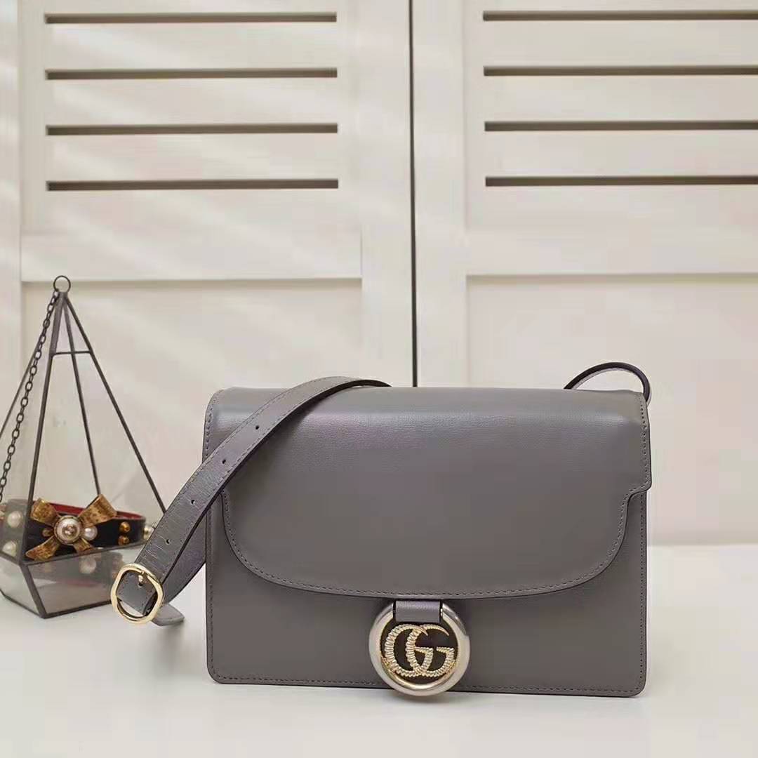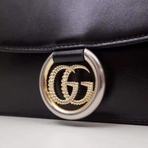 Presented in textured dusty grey leather, this small structured shoulder bag introduced for Fall Winter 2019 reintroduces the Double G with a twisted torchon finish surrounded by a ring.